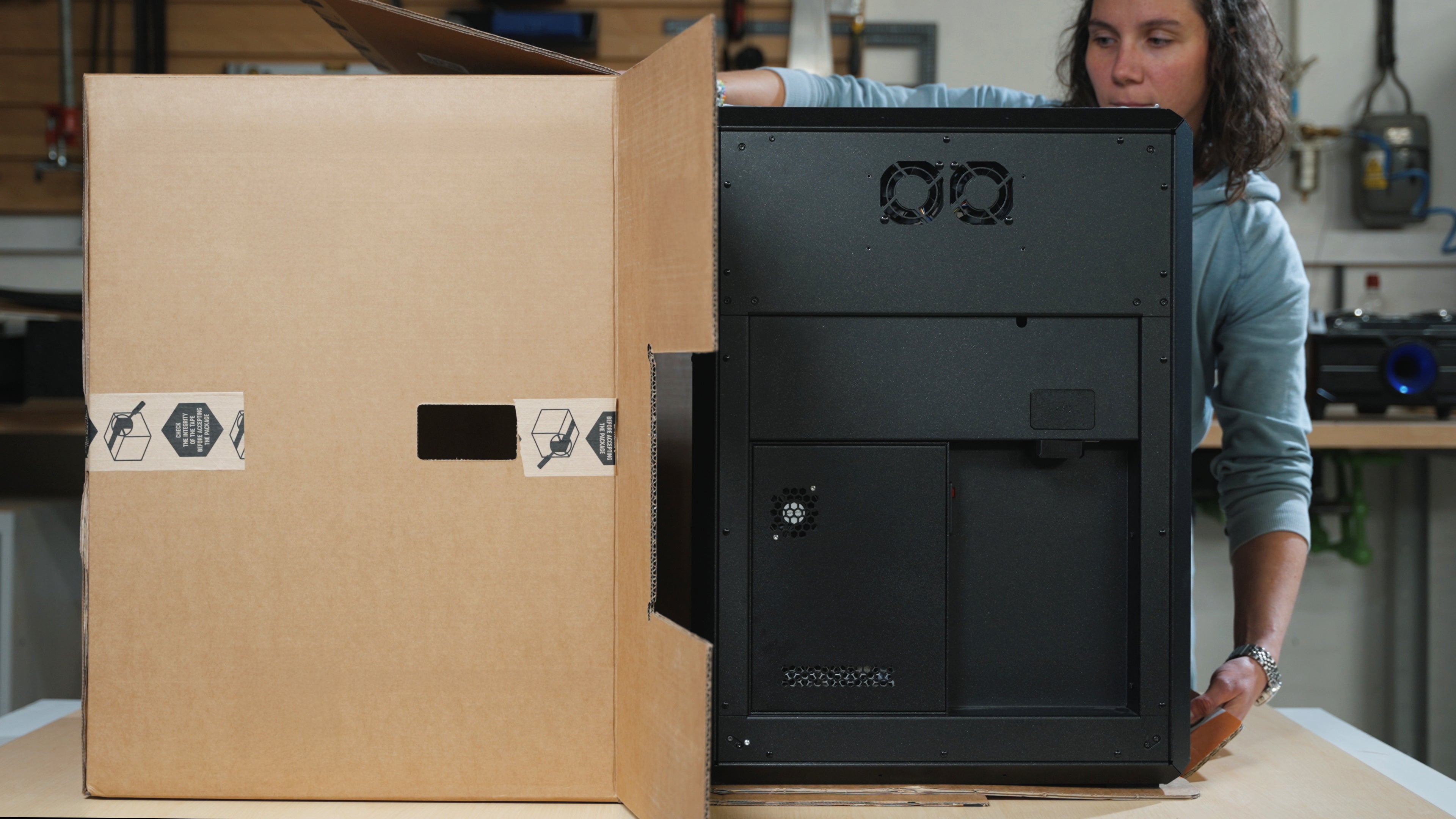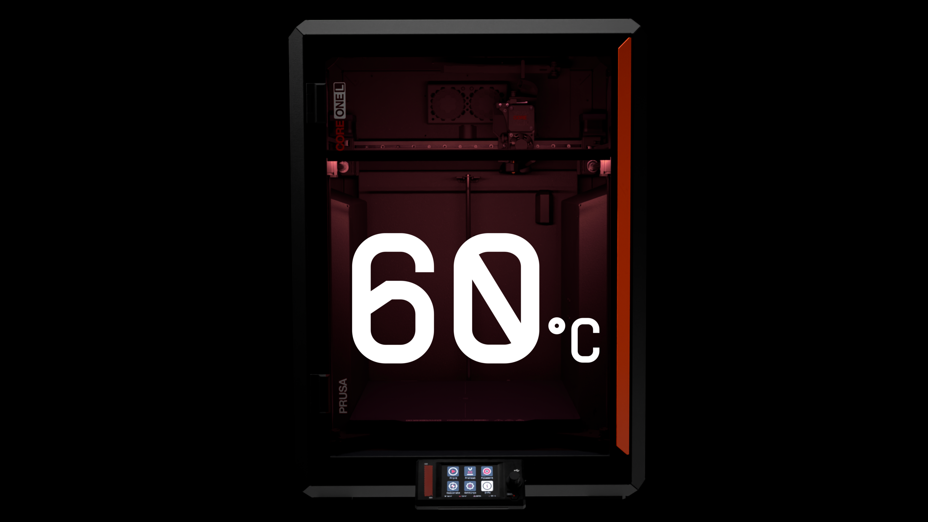 Prusa CORE One Lは、300 × 300 × 330 mm のビルドボリュームを実現しつつ、本体サイズは従来機の約110%に抑制。スチールフレームとアルミパネルによる高剛性エクソスケルトン構造により、振動を最小限に抑え、静粛性と寸法精度を維持します。