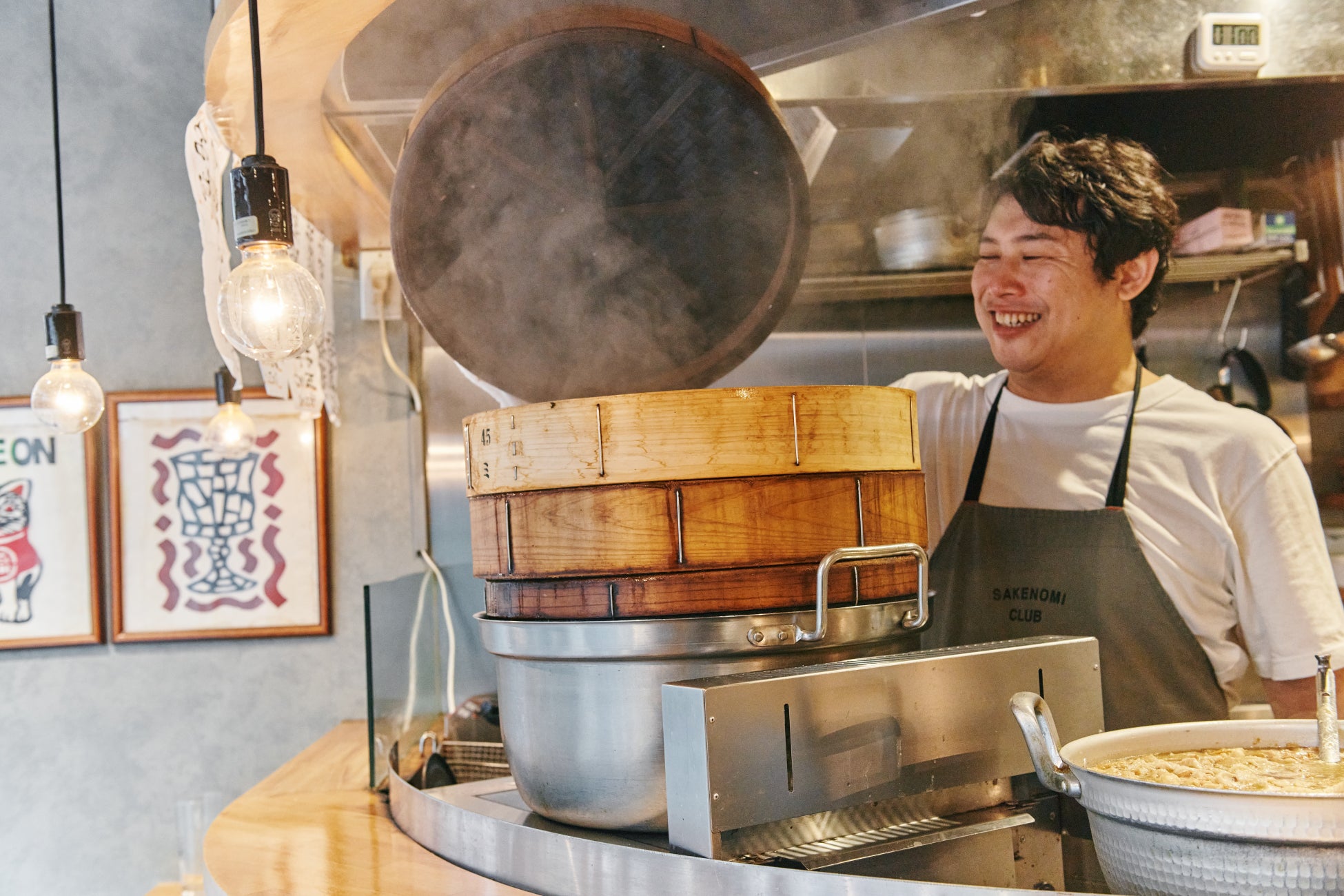 キッチン内で存在感を放つ大きな蒸籠で蒸し上げる“名物蒸しつくね”は、