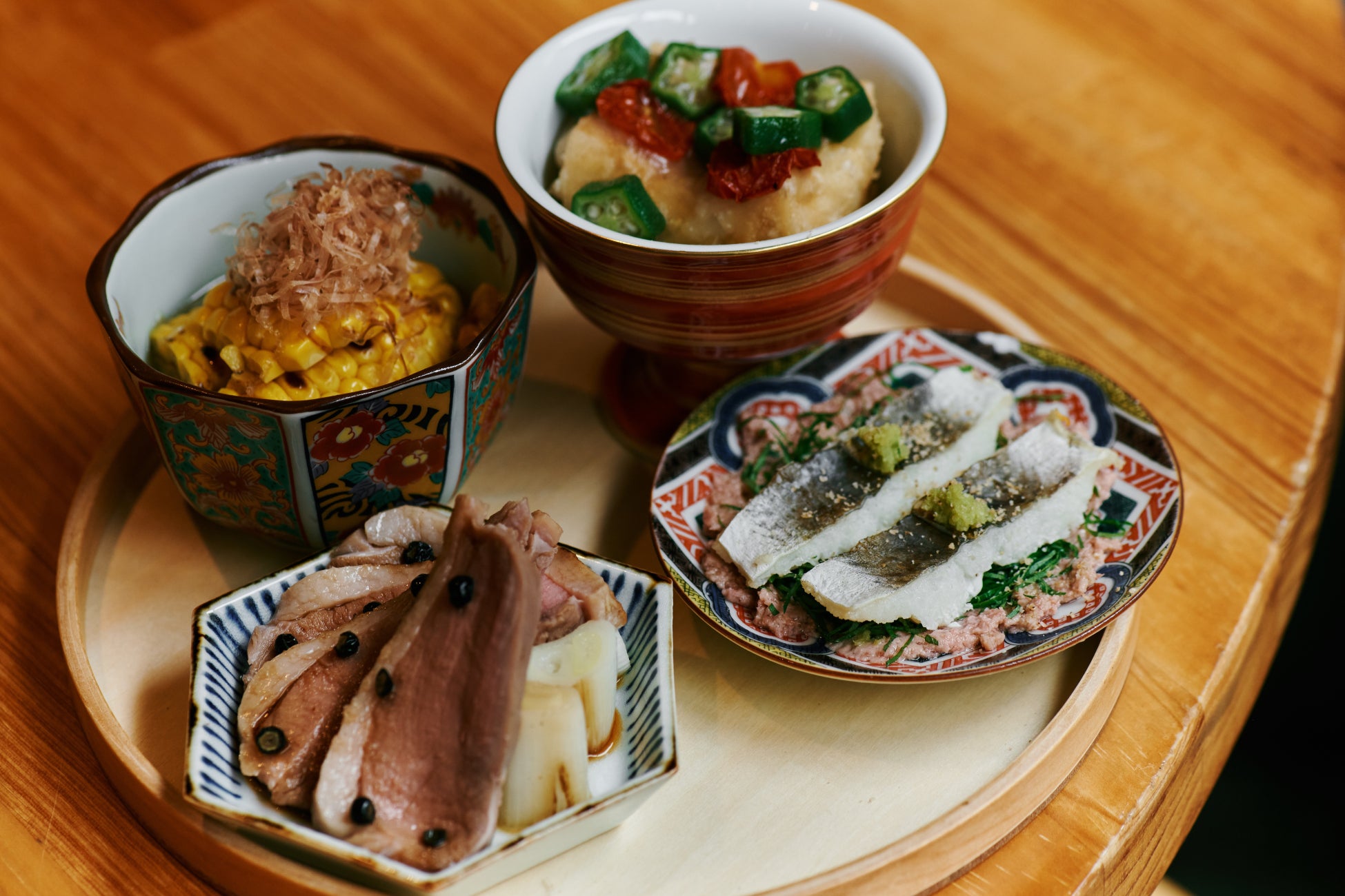 鴨肉のたたき 生胡椒醤油/鱧の白焼き~白胡麻梅肉~/焼きとうもろこしのお浸し/胡麻豆腐揚げ出し セミドライトマトとオクラ餡