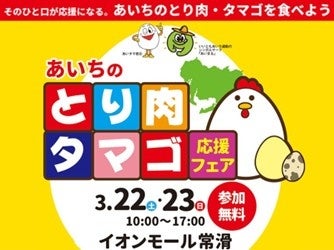 あいちのとり肉・タマゴ消費拡大実行委員会(構成員:愛知県、愛知県経済農業協同組合連合会、一般社団法人愛知県養鶏協会、 一般社団法人愛知県配合飼料価格安定基金協会、公益社団法人愛知県畜産協会)は、2025年3月22日(土)と3月23日(日)の2日間、イオンモール常滑 イオンスタイル常滑食品催事場等(常滑市りんくう町2丁目 20 番3)にて、愛知県産のとり肉・タマゴを食べて生産者を応援することを目的とした「あいちのとり肉・タマゴ応援フェア」を開催いたします。