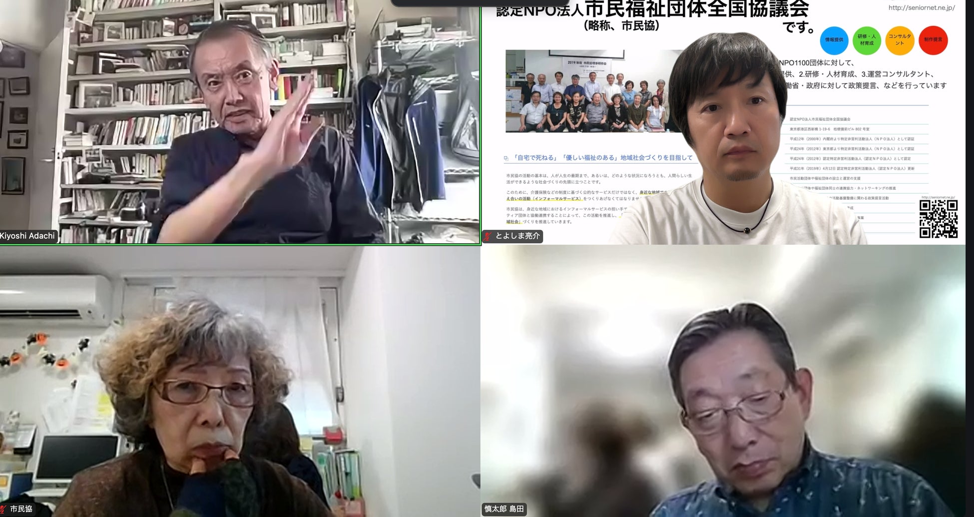介護系NPO1000団体の会員を有し、優しい福祉のある地域社会づくりを推進している認定NPO法人市民福祉団体全国協議会は、2024年10月23日(金)、zoomにて第8回調査研究委員会を開催しました。