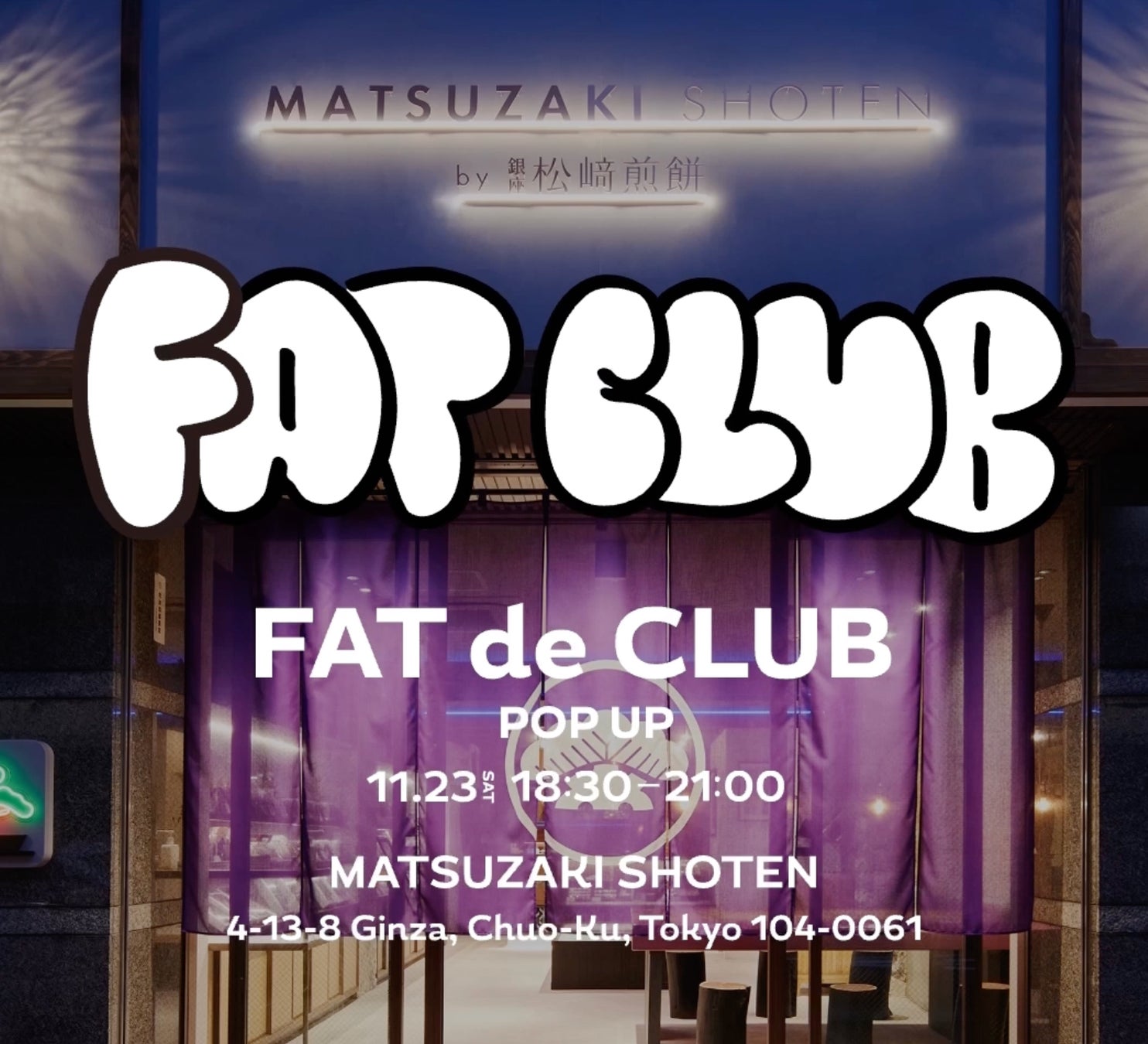 現代美術作家・加賀美健による、ロゴ監修ブランド「FAT CLUB」新作発売に先駆け、創業1804年「銀座 松﨑煎餅」とのPOPUP「FAT de CLUB」を11月23日(土)に銀座本店にて開催。