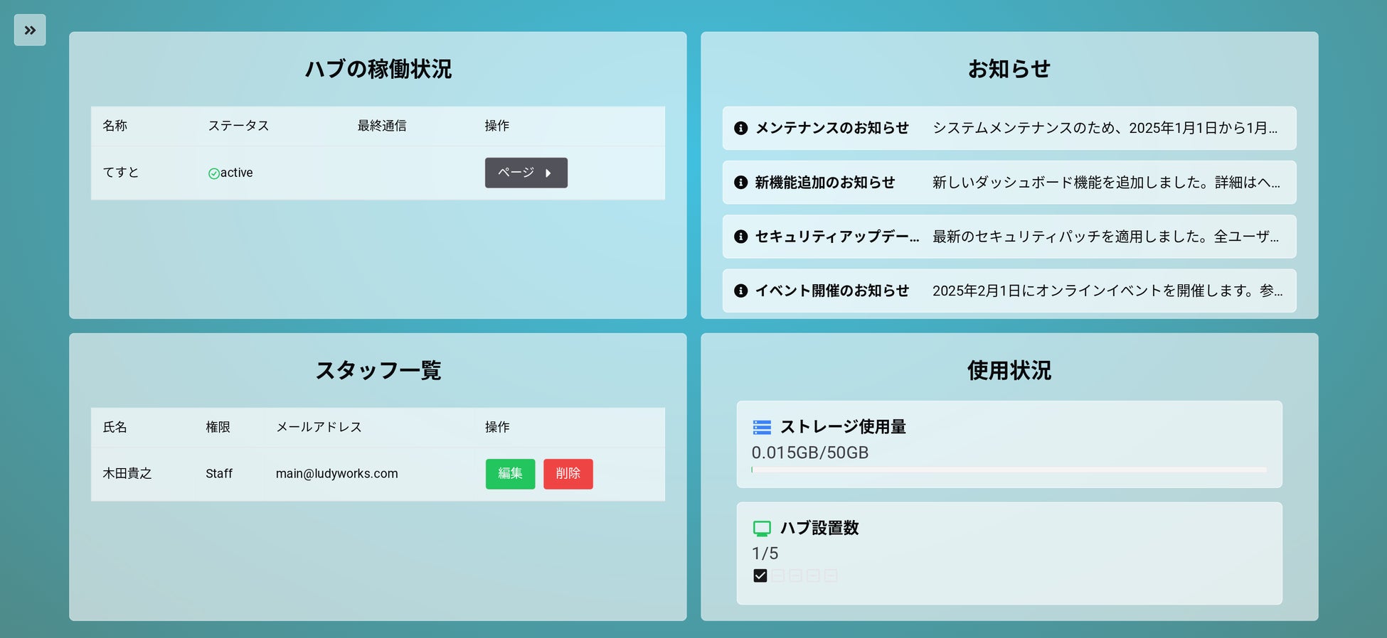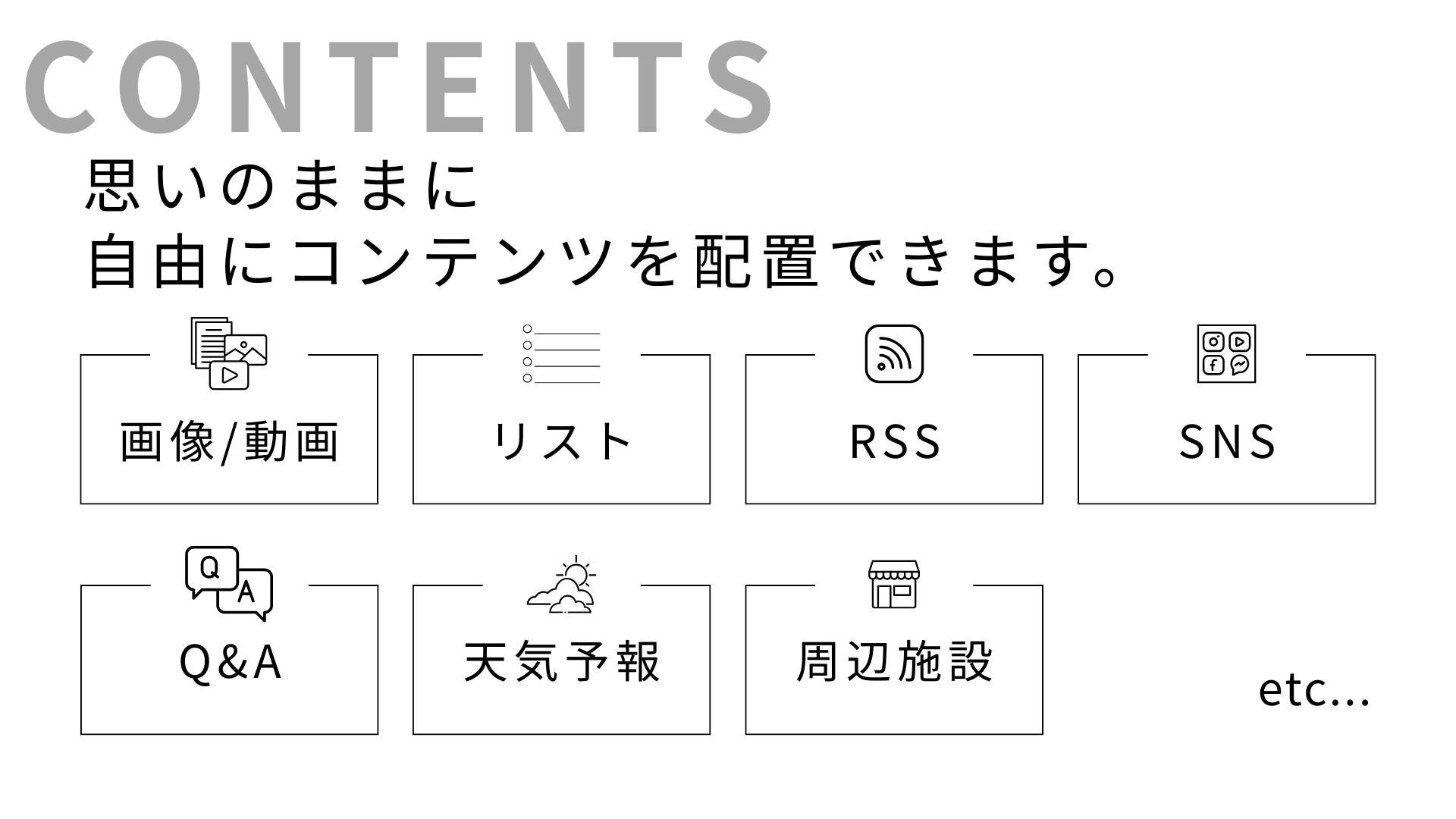 プログラミング知識不要の専用CMS「コンテンツビルダー」を標準搭載しております。お客様自身が、まるでブログを更新するような手軽さで、いつでも・何度でも・無料で情報の差し替えが可能です。これにより、常に最新の情報を提供できます。Q&A、多言語翻訳、周辺施設案内、アクセス分析、広告配信機能など、多彩な機能を標準搭載およびオプションで提供いたします。Webアプリケーションベースであるため、サイネージ以外のPCやスマートフォンなど、幅広いデバイスに対応しており、将来的な機能追加も容易です。