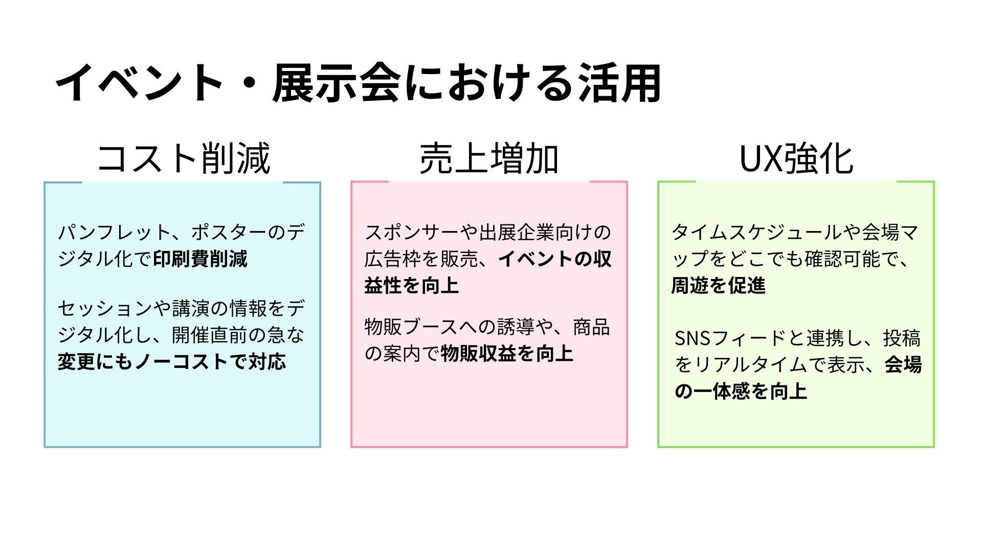 紙のプログラムや会場マップの印刷が不要になり、急なセッション変更や出展者情報の修正もリアルタイムで対応可能です。