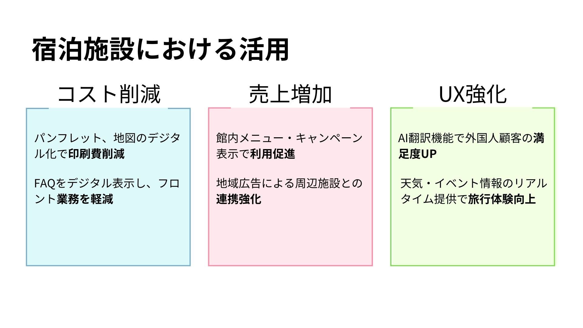 紙のパンフレット、館内案内、周辺地図、時刻表などをデジタル化し、印刷コストと差し替えの手間を大幅に削減します 。
