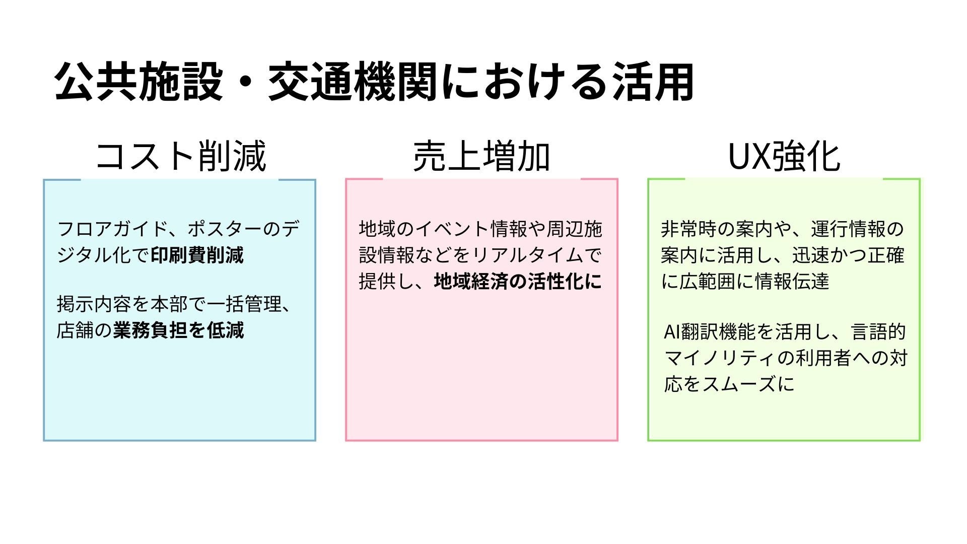 各種手続きの案内、施設マップ、時刻表などの印刷物を削減し、情報を一元化することでコストを圧縮します 。