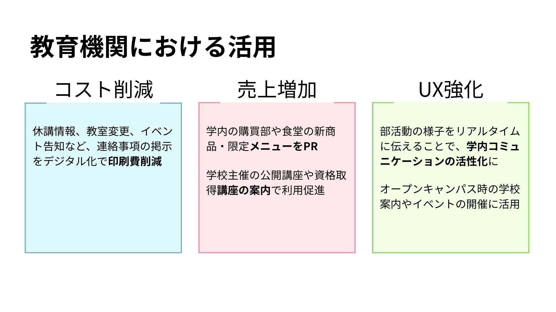 休講情報、教室変更、イベント告知など、日々変動する学内連絡事項の掲示を完全ペーパーレス化。印刷コストをゼロにします。