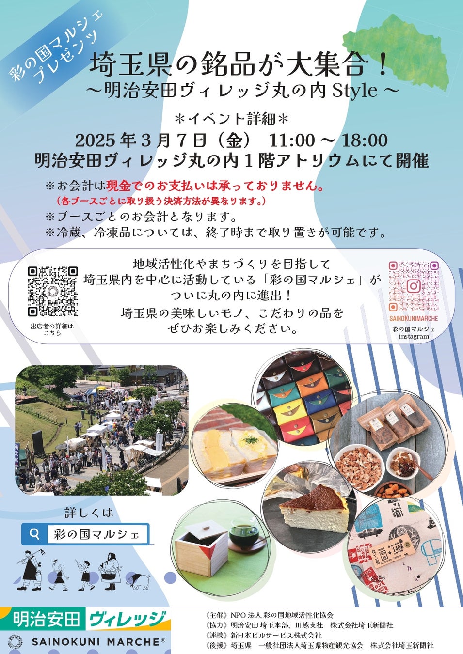 NPO法人 彩の国地域活性化協会(拠点:埼玉県さいたま市、代表理事:佐々木 輝伸)が主催する「彩の国マルシェ」は、2025年3月7日に東京都千代田区にある明治安田ヴィレッジ丸の内にて「彩の国マルシェ~明治安田ヴィレッジ丸の内Style~」を開催いたします。