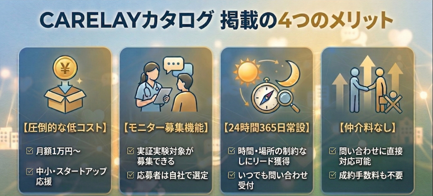 『CARELAYカタログ』は、月額1万円という価格にこだわりました。それは、どんなに小さな企業の優れたアイデアも、平等に現場へ届くチャンスを作るためです。
