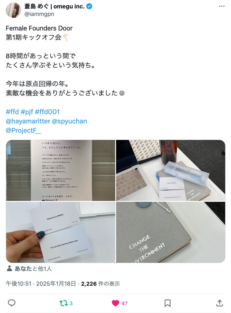 「Female Founders Door」の一期生の女性たちがプログラムを通じてプロダクトを作り、起業家となり、雇用を生み出し、将来的にルールをつくる女性たちとなっていく姿に想いを馳せております。キックオフ当日は、皆さんの熱気を肌で感じることができ、皆さんならば将来ルールメイカーになる確信を持てました、やっていきましょう!