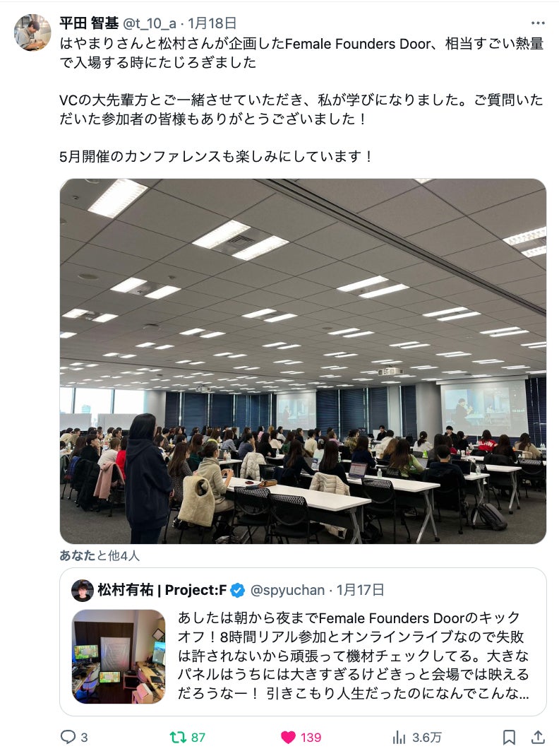 また、「Project:F」では「Female Founders Door」の他に、女性がスタートアップや起業について知ることができる場所として、2025年5月17日(土)、女性向けのスタートアップカンファレンス「Female Founders Conference」の開催を予定しております。