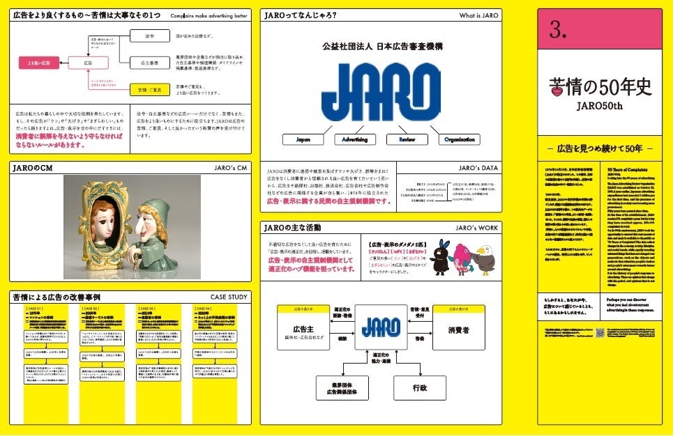 JAROは消費者に迷惑や被害を及ぼすウソや大げさ、誤解をまねく広告をなくし消費者から信頼される良い広告を育てたいという思いから、広告主や新聞社、出版社、放送会社、広告会社や広告制作会社などの広告に関係する企業が自ら集い、1974年に設立された広告・表示に関する民間の自主規制機関です。2024年に設立50周年を記念して、50年間の受付件数約26万件を取りまとめた「苦情の50年史」を公開しました。