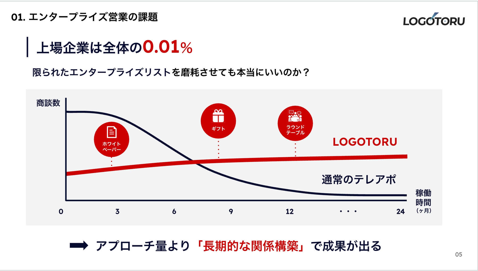 限られたリストをいかに長期的にフォローし続けられるかなど、ロゴトルの特徴をシャープに伝えられる営業資料へ