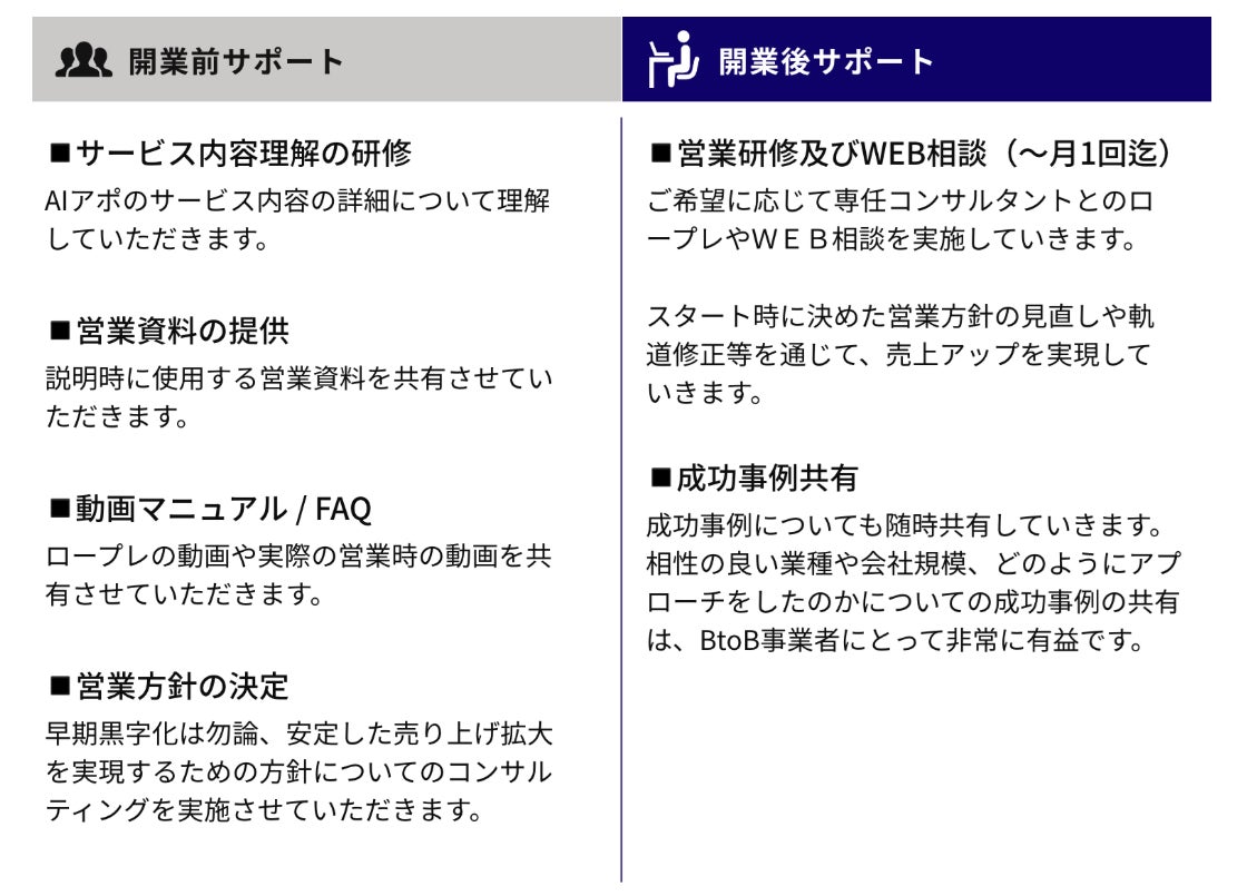 営業未経験者でも早期黒字化を実現していただけるよう、開業前も開業後も徹底的にサポートさせていただきます。