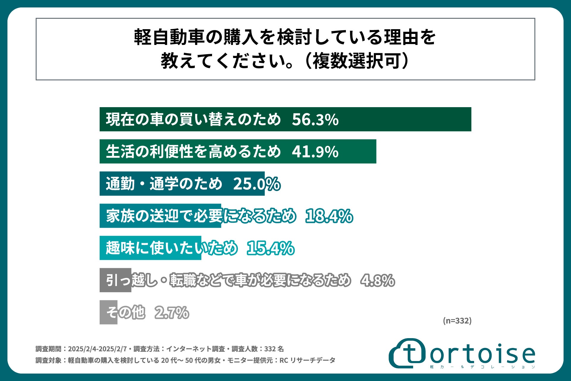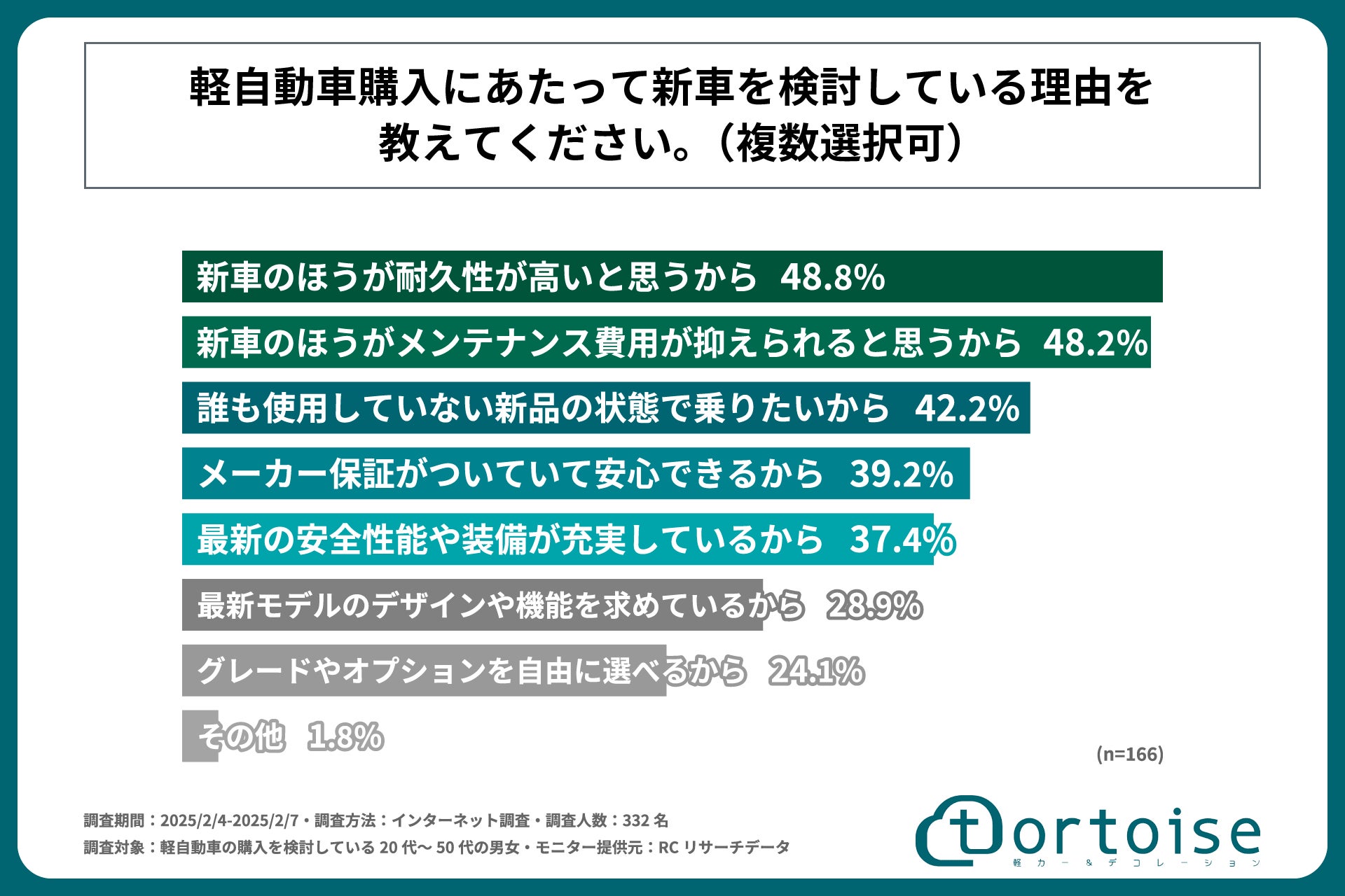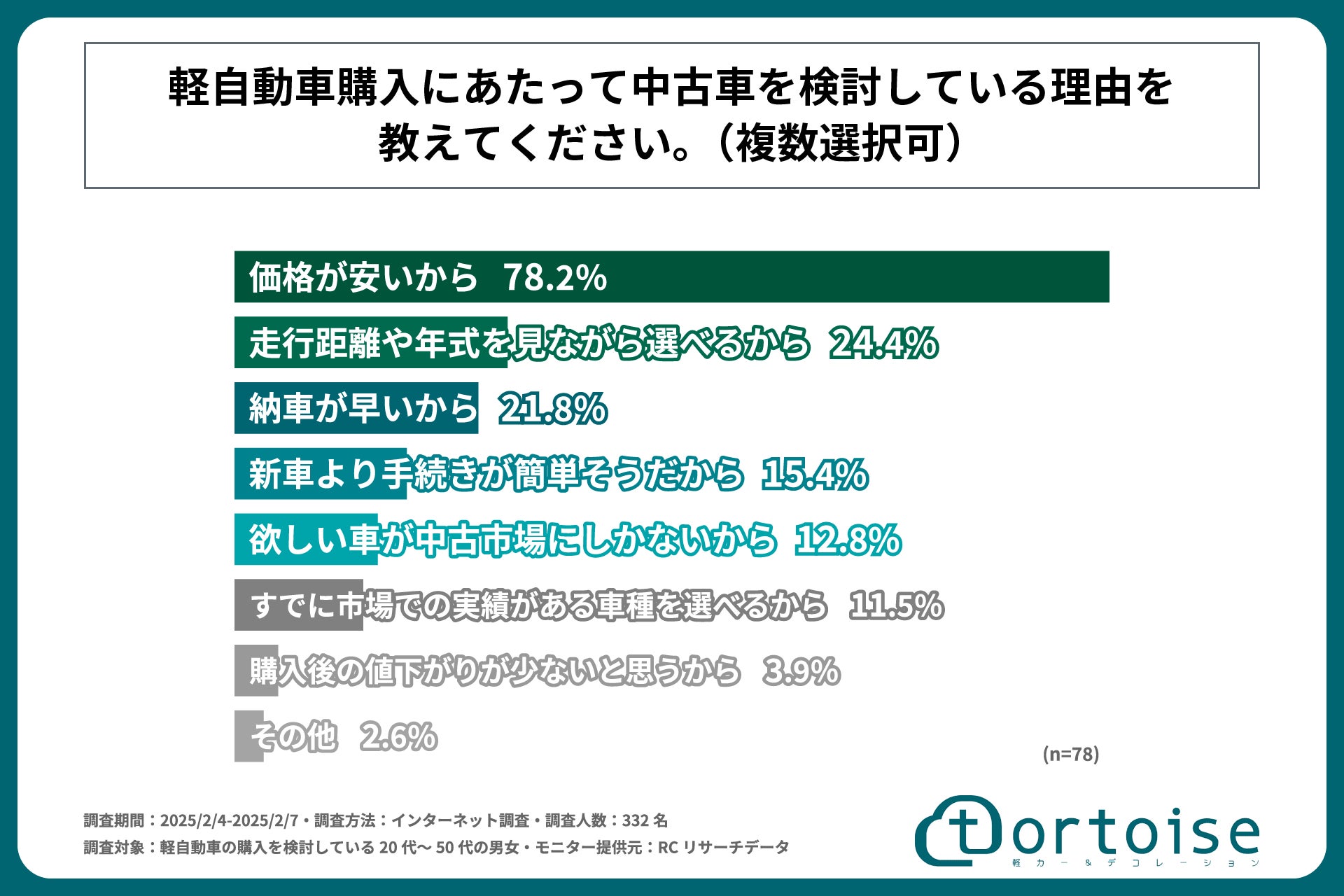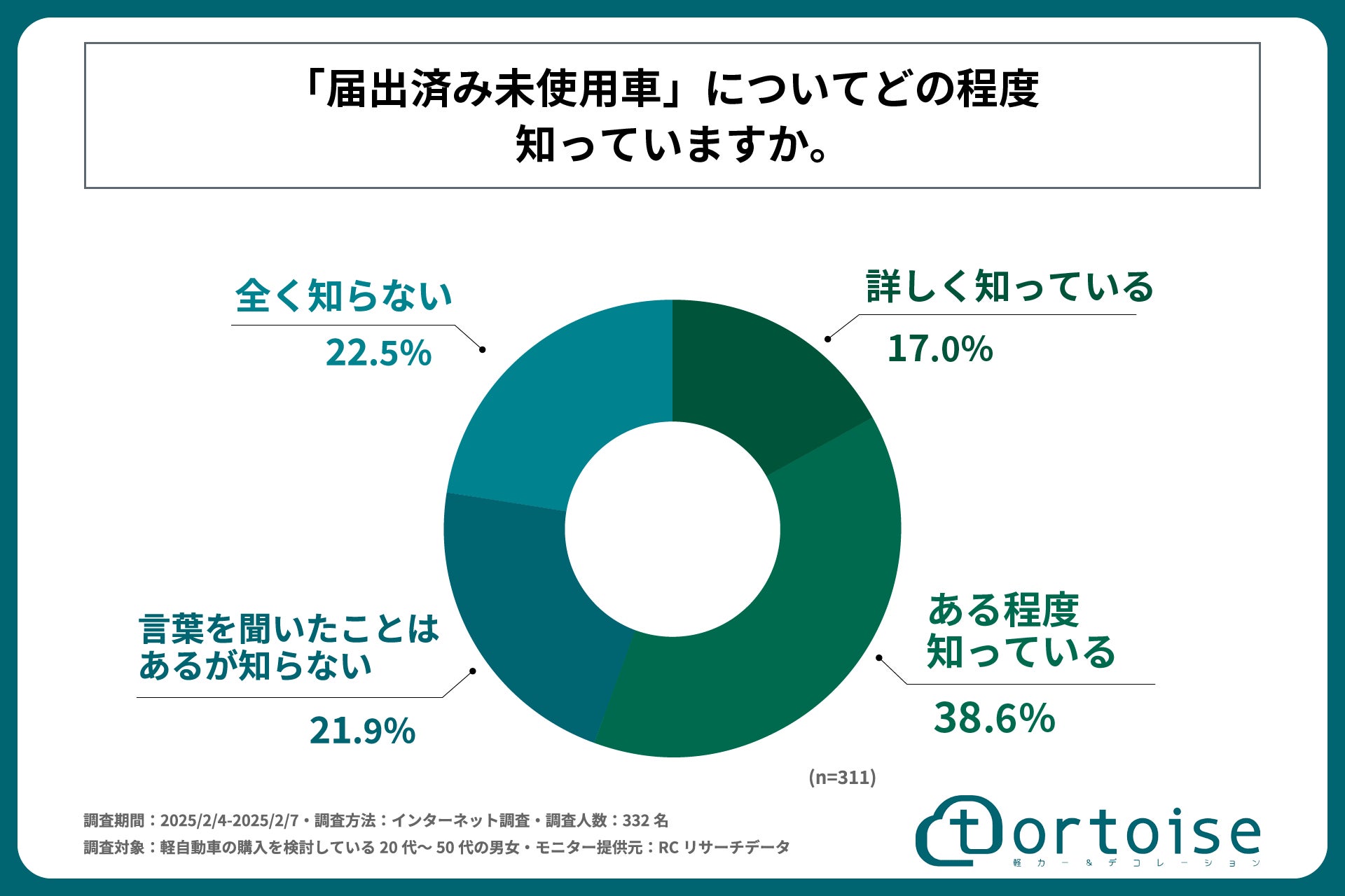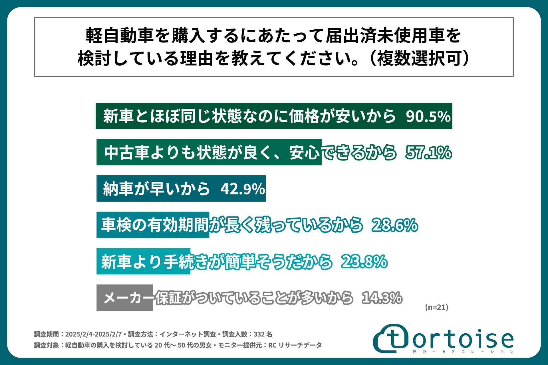 株式会社トータス(本社:神奈川県大和市、代表取締役:村野 公紀)が展開する「tortoise」は、軽自動車の購入を検討している20代~50代の男女を対象に「軽自動車購入検討者の新車・中古車・届出済み未使用車に対する意識と選択基準に関する調査」を実施しました。