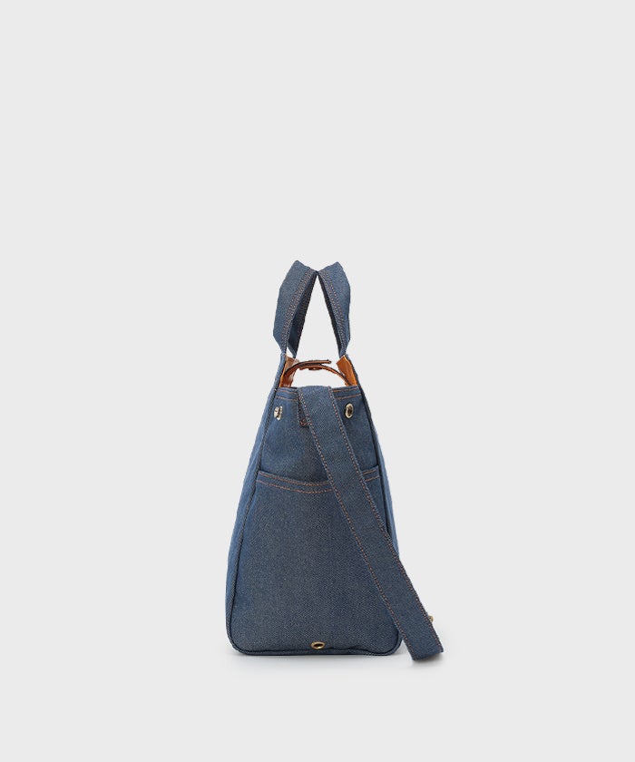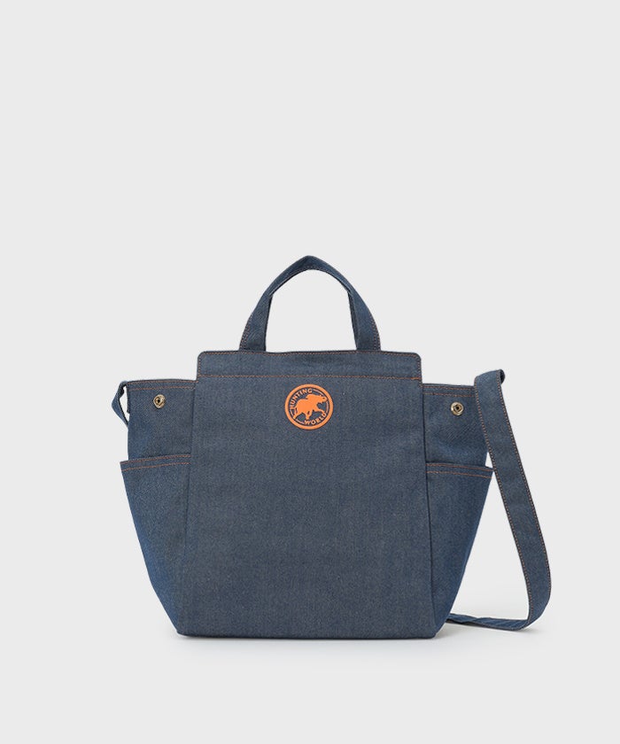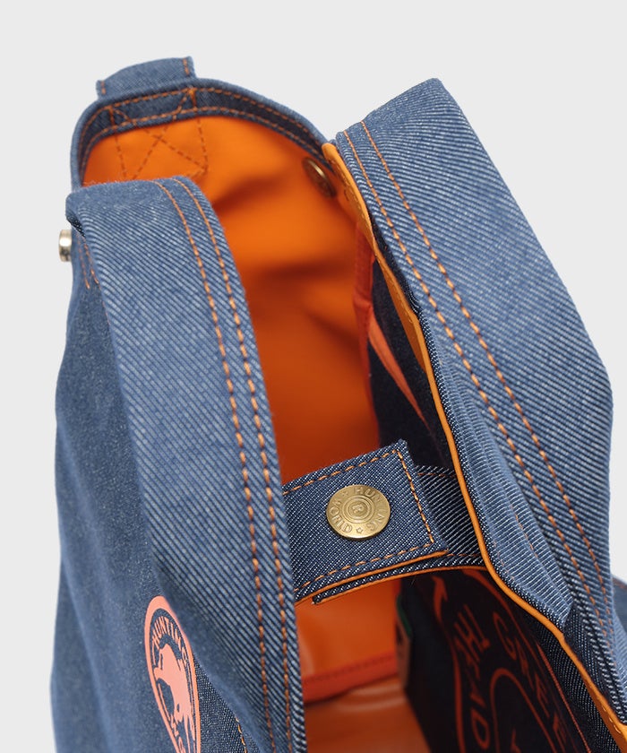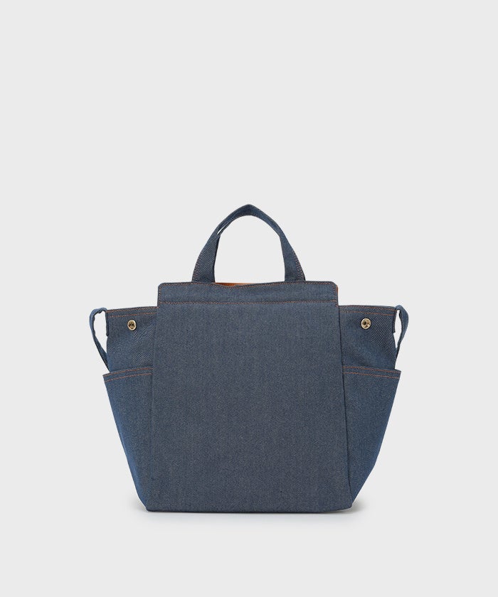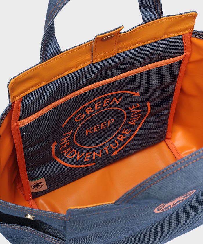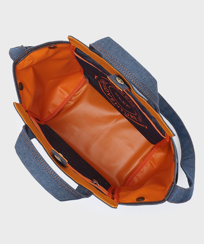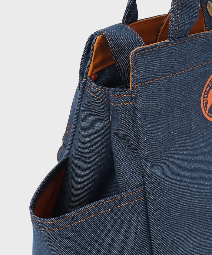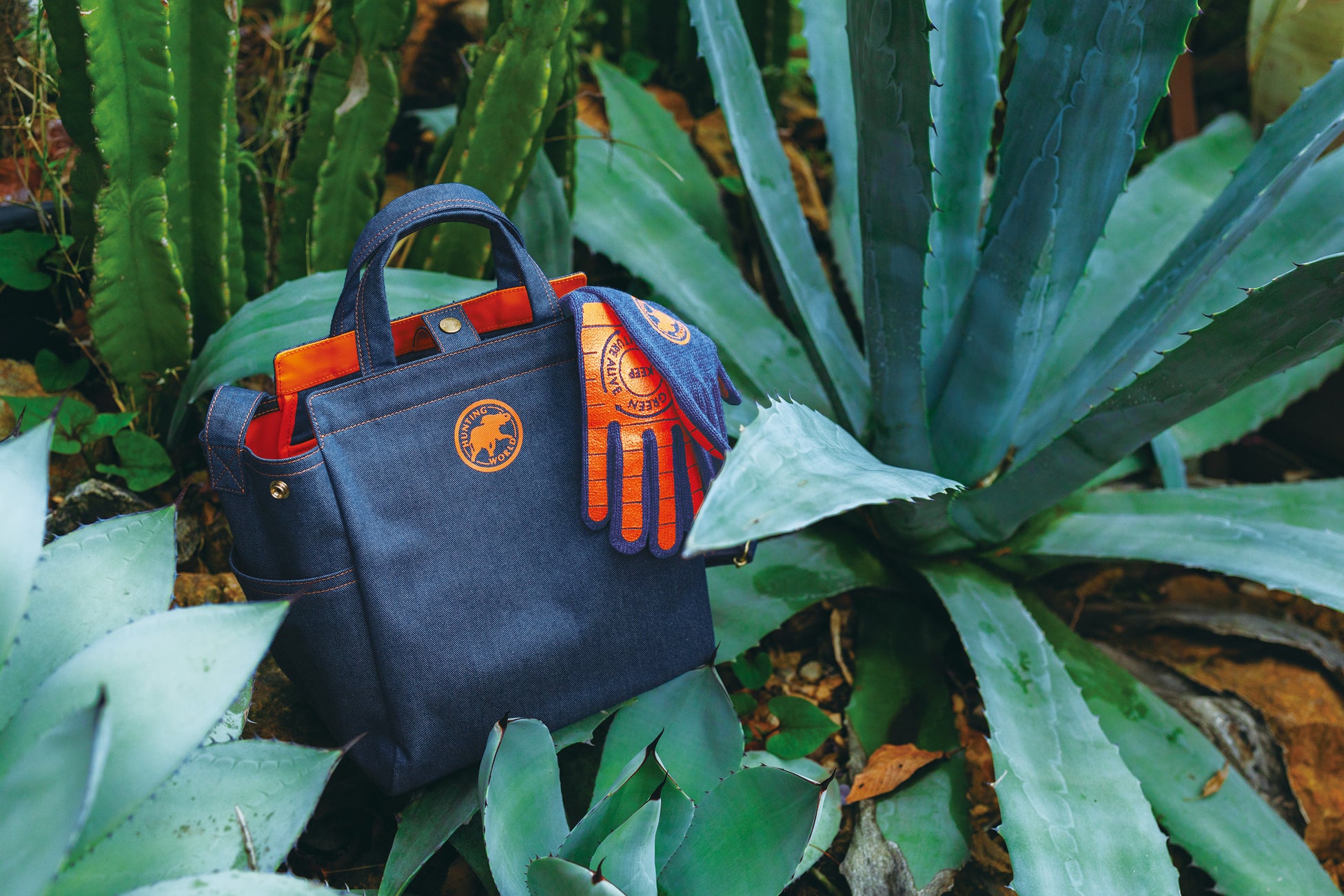 収穫をテーマに包み込むようなかごからインスパイアされたバッグ。両サイドのスナップボタンにより、側面のシルエットが変化することで、雰囲気の違いを楽しめ、コーデの幅を広げられます。ガーデニングとの相性から、ワークウェアの象徴でもあるデニム素材を採用。リサイクルポリエステル×コットンによるエコ素材でありつつ、ポリエステル素材を染色しているため堅牢度が高く色落ちもしにくい特徴があります。生地の裏側にはガーデニンググッズを収納することも考えて、鋭利な道具から守り、耐水力を高めるためのPVC加工を施しています。荷物の量に合わせて、クロスボディショルダーとしても使える2way仕様。インナーには11インチのデジタルデバイスを納められるスリットポケット付き。さわやかなデニムブルーに映えるビビッドなオレンジのアクセントが効いたデザインです。