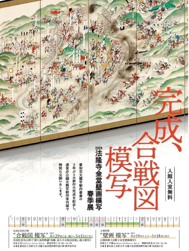 愛知県立芸術大学では、2025年法隆寺金堂壁画模写春季展として「完成、合戦図模写」を開催いたします。愛知県立芸術大学では、日本画専攻初代教授片岡球子の主導のもと1974年よりわが国古典絵画の模写制作に取組んできました。本展では、その第一弾である《法隆寺金堂壁画模写》を2年ぶりに公開再開するとともに、3月に完成したばかりの《「徳川美術館蔵『長篠・長久手合戦図屏風』」復元模写》を初公開いたします。