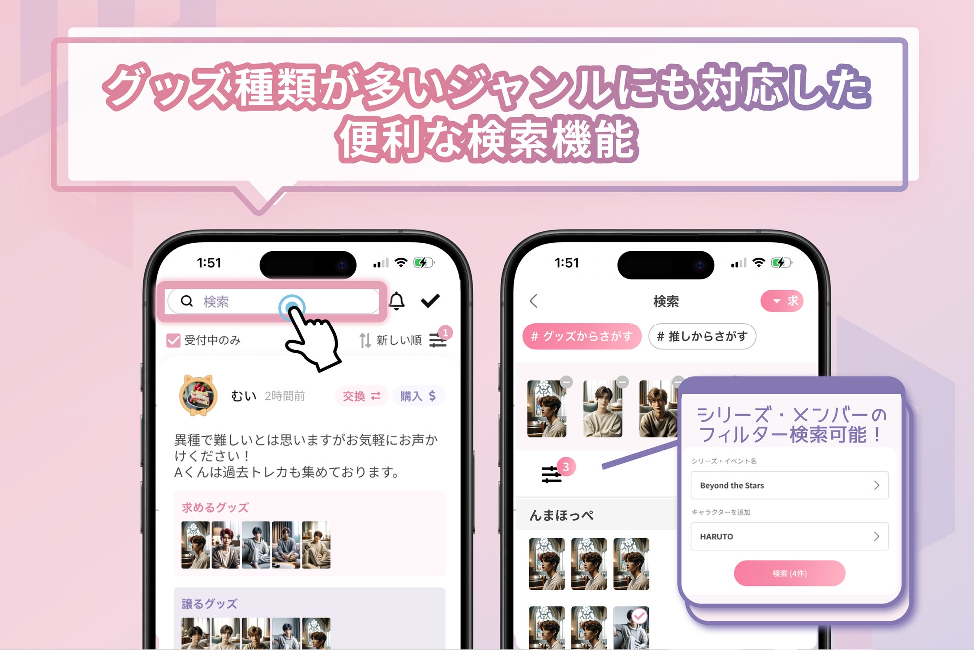 ・グッズやメンバーの名前を「求・譲」それぞれで指定、自分が希望するアイテムを簡単に探せる