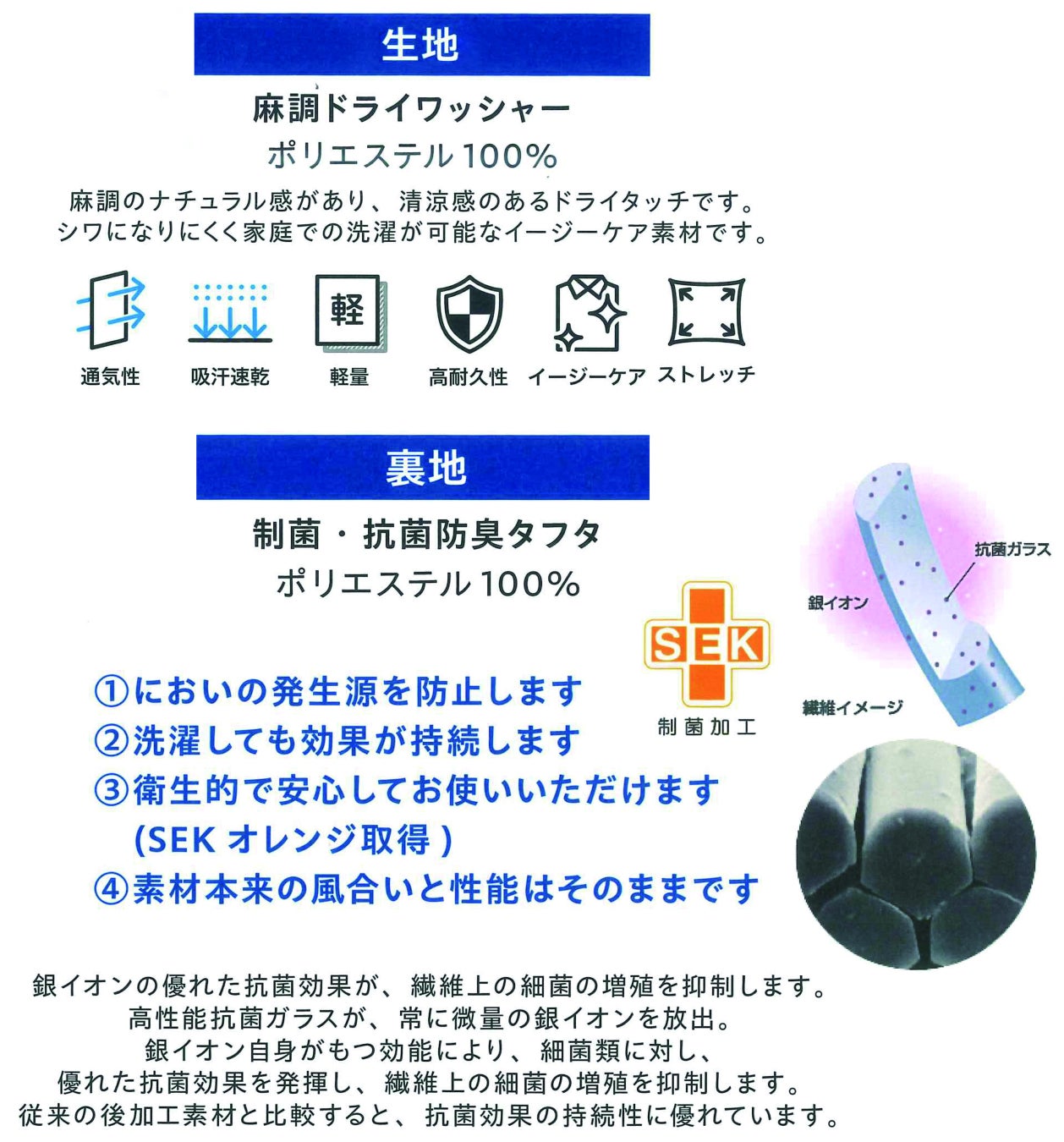 表地には、麻調でナチュラルかつ清涼感のあるポリエステル素材を使用。裏地には、においの発生を防ぐ制菌・抗菌防臭タフタを採用しています。家庭での洗濯が可能で、快適さと衛生面の両立を実現しています。