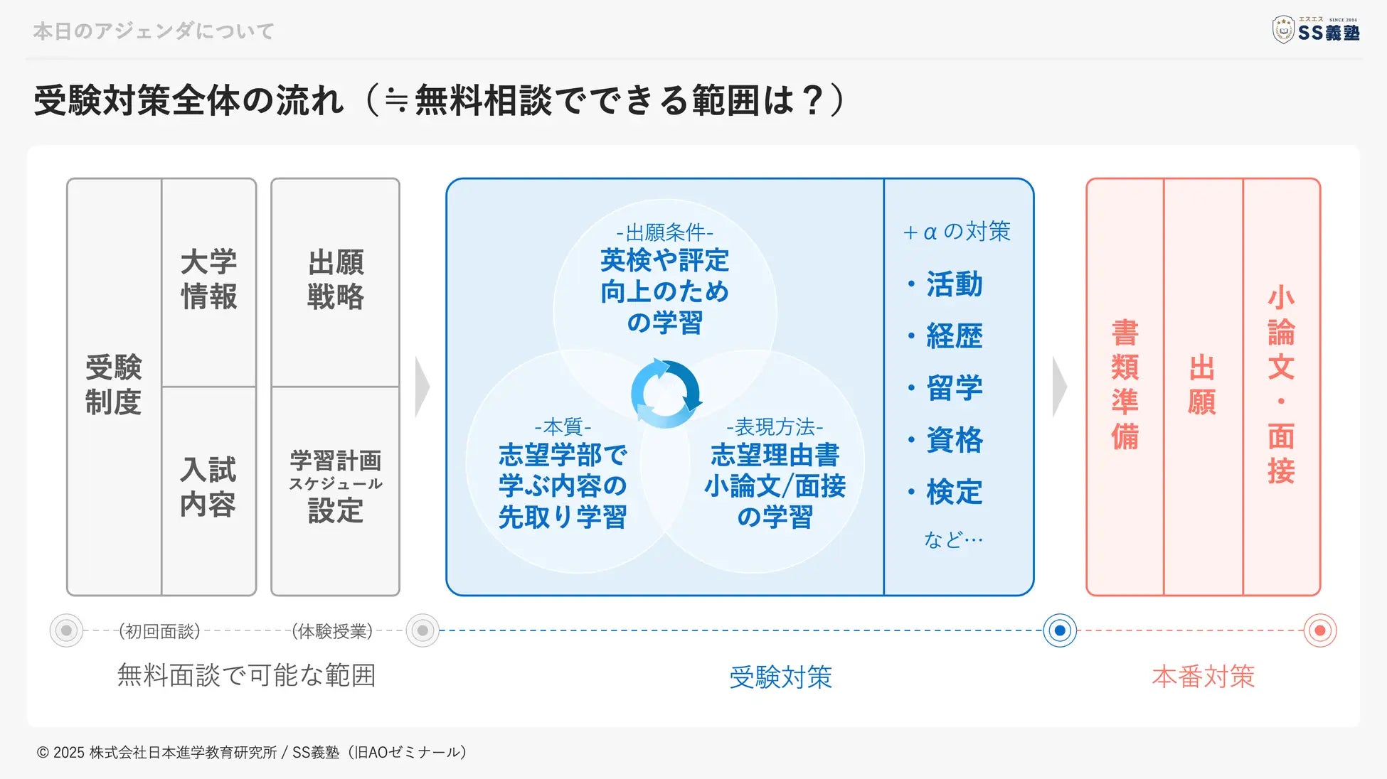 現在、AO / 推薦入試の最老舗であり、最大手であるSS義塾(旧 AOゼミナール)では無料の資料請求と受験相談を実施しています。この道で12年以上実績を出してきた AO / 推薦入試業界のベテラン講師や大学入試の作問に携わる大学教授や教員などが最適な受験方式・併願戦略・合格ルートをご提案いたします。