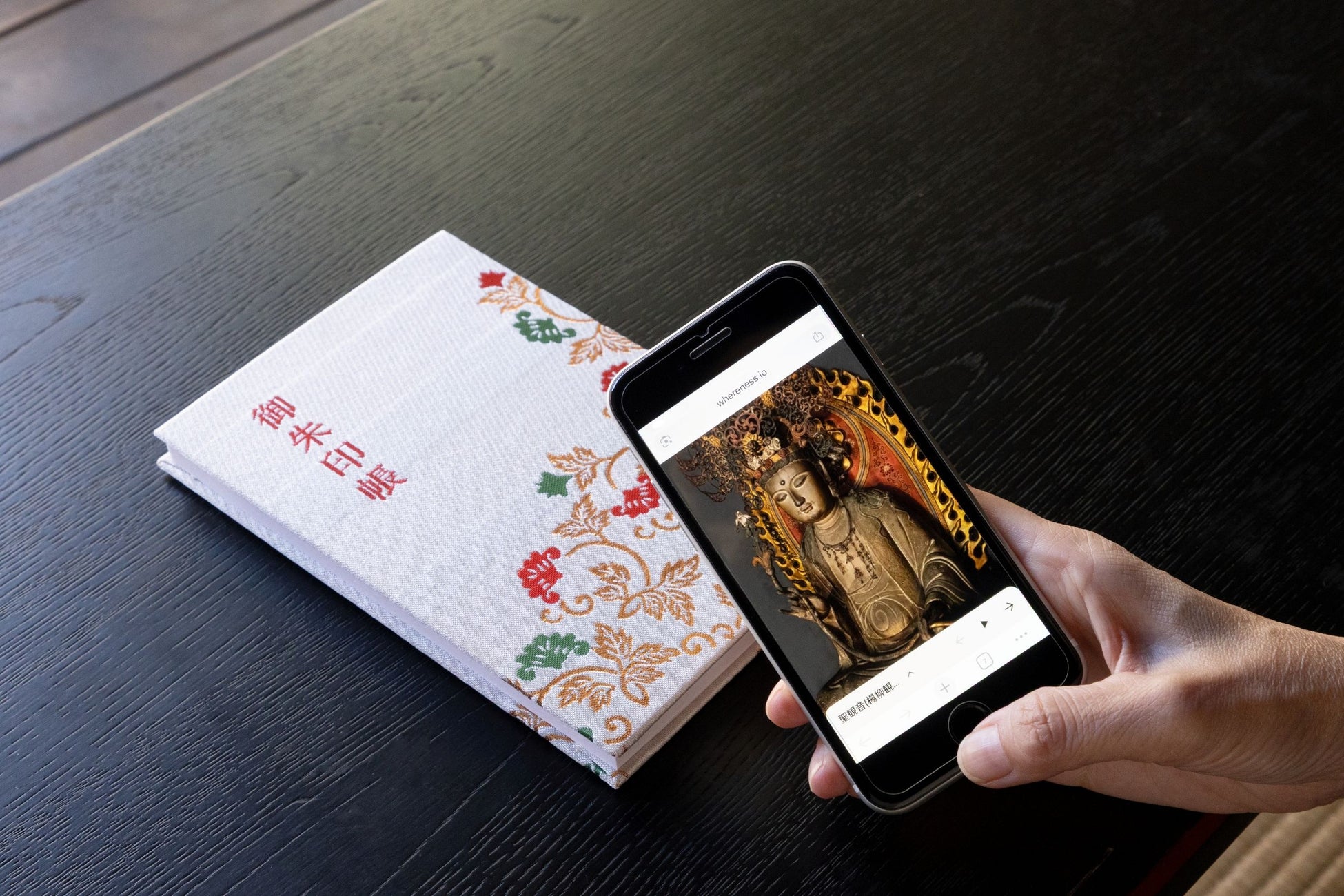 スマートフォンをかざすと、重要文化財・楊貴妃観音像を3D拝観できる御朱印帳。