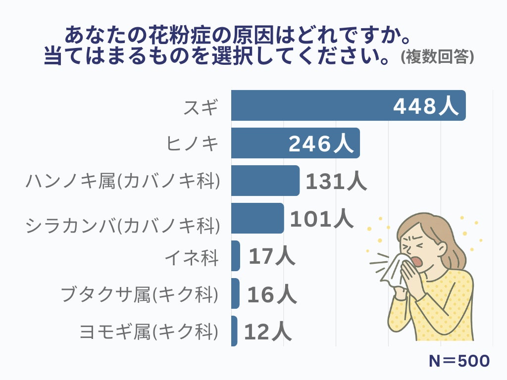 花粉症の原因について聞いたところ、「スギ」(448人)、「ヒノキ」(246人)がダントツで多く、いわゆる“春の花粉症”に悩む人が大半を占める結果となりました。一方で「ハンノキ属(カバノキ科)」(131人)、「シラカンバ(カバノキ科)」(101人)といった樹木由来の花粉も一定数の影響を与えているようです。