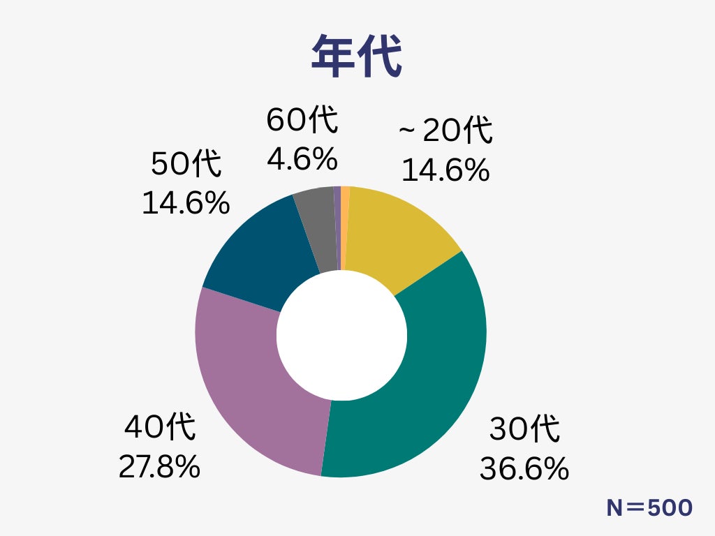 調査に回答した500名のうち、女性が70.8%と大半を占め、男性は29.2%でした。年齢層では30代が36.6%と最多で、40代が27.8%、20代と50代が14.6%ずつという構成になりました。