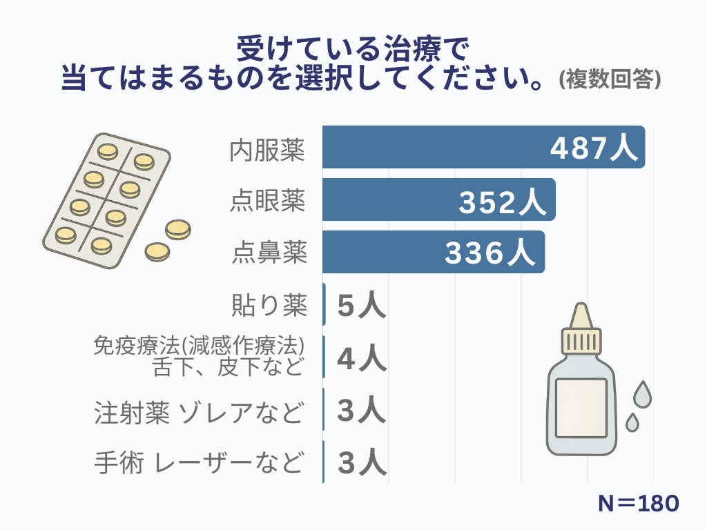 治療を受けている人に具体的な方法を聞いたところ、「内服薬」(487人)が最も多く、次いで「点眼薬」(352人)、「点鼻薬」(336人)となりました。貼り薬や免疫療法、注射薬、手術などの選択肢はあるものの、現時点では少数派のようです。