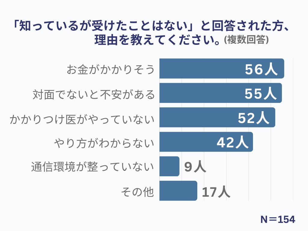 また、オンライン診療を「知っているが利用していない」人に理由を聞くと、「お金がかかりそう」「対面でないと不安」「かかりつけ医が対応していない」など、不安感やハード面での課題が浮かび上がっています。