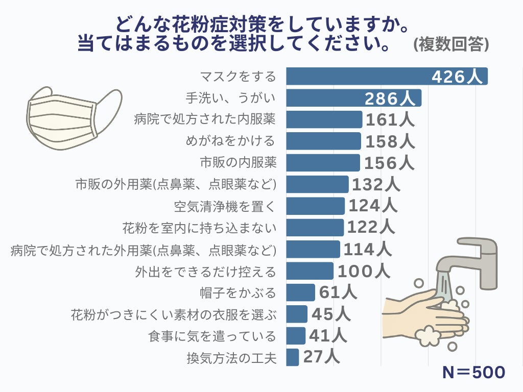 そのほか、「玄関に花粉を落とすブラシを設置」「衣類用の花粉バリアスプレーを使用」といったユニークな実践例もあり、マスクを起点にさまざまな対策が展開されていることが明らかになりました。