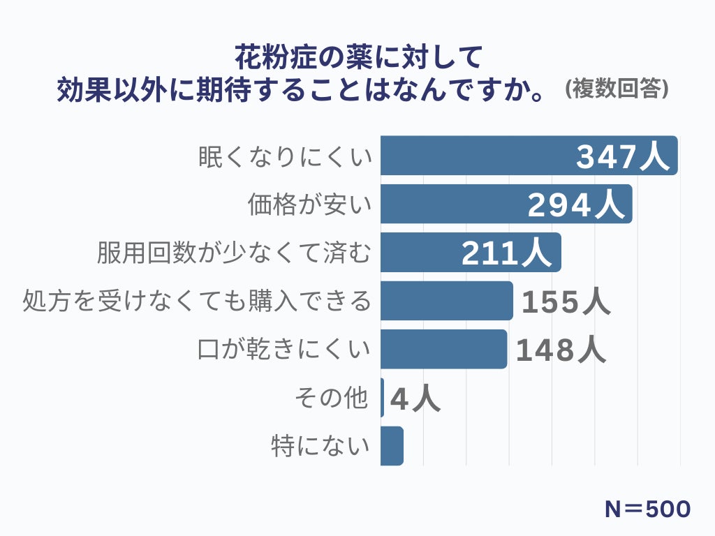 アンケートでは、「眠くなりにくい」(347人)、「価格が安い」(294人)、「服用回数が少なくて済む」(211人)、「味やにおいが気にならない」(109人)といった点が重視されていることがわかりました。