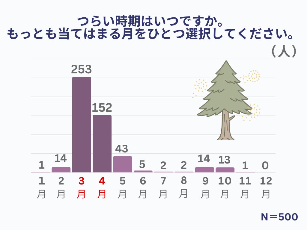 「つらいと感じる時期」を尋ねたところ、3月が最多の253人で、4月(152人)、5月(43人)と続きました。スギやヒノキ花粉の飛散量が多いこの時期に、つらさのピークを迎える方が圧倒的多数でした。