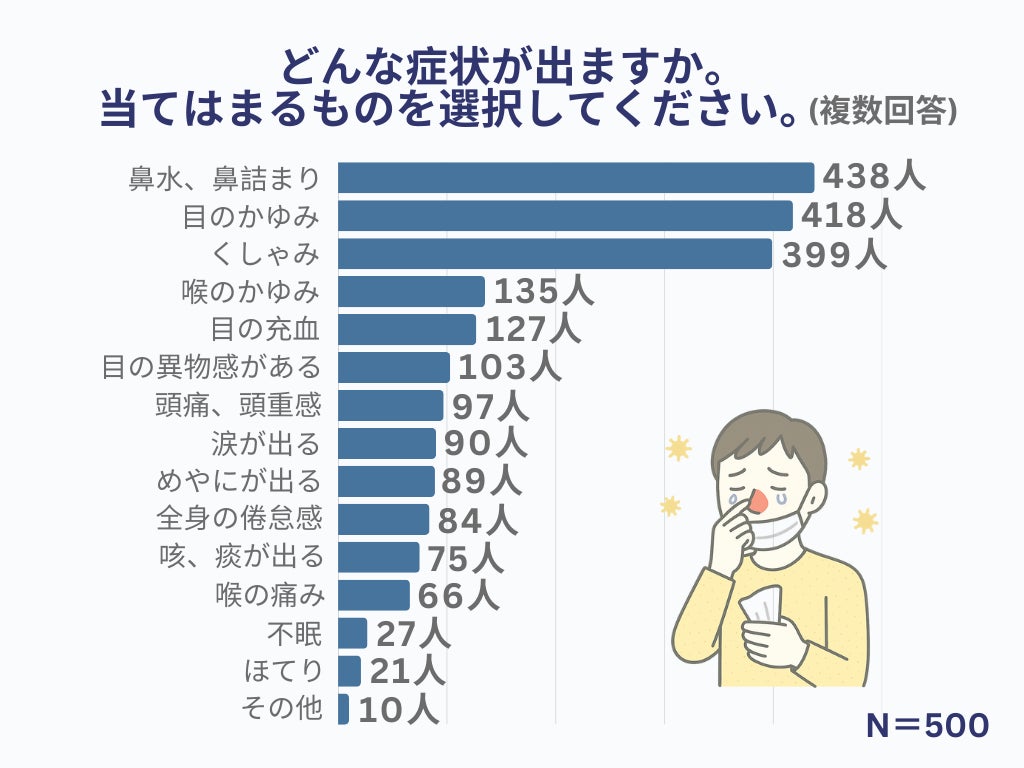 「どんな症状が出ますか?」という質問に対して、最も多かったのは「鼻水、鼻づまり」(438人)、次いで「目のかゆみ」(418人)、「くしゃみ」(399人)という結果になりました。