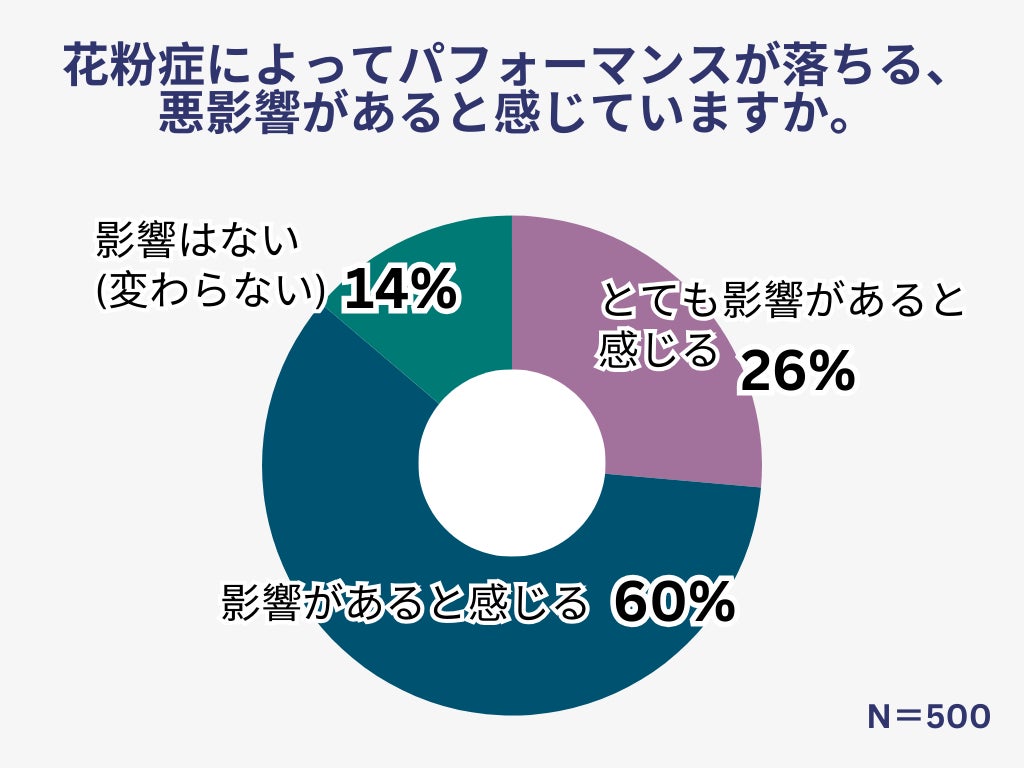 花粉症が生活や仕事に与える影響については、「とても影響がある」と感じている人が26%、「影響があると感じる」が60%で、合わせて86%が何らかの悪影響を実感していることがわかりました。