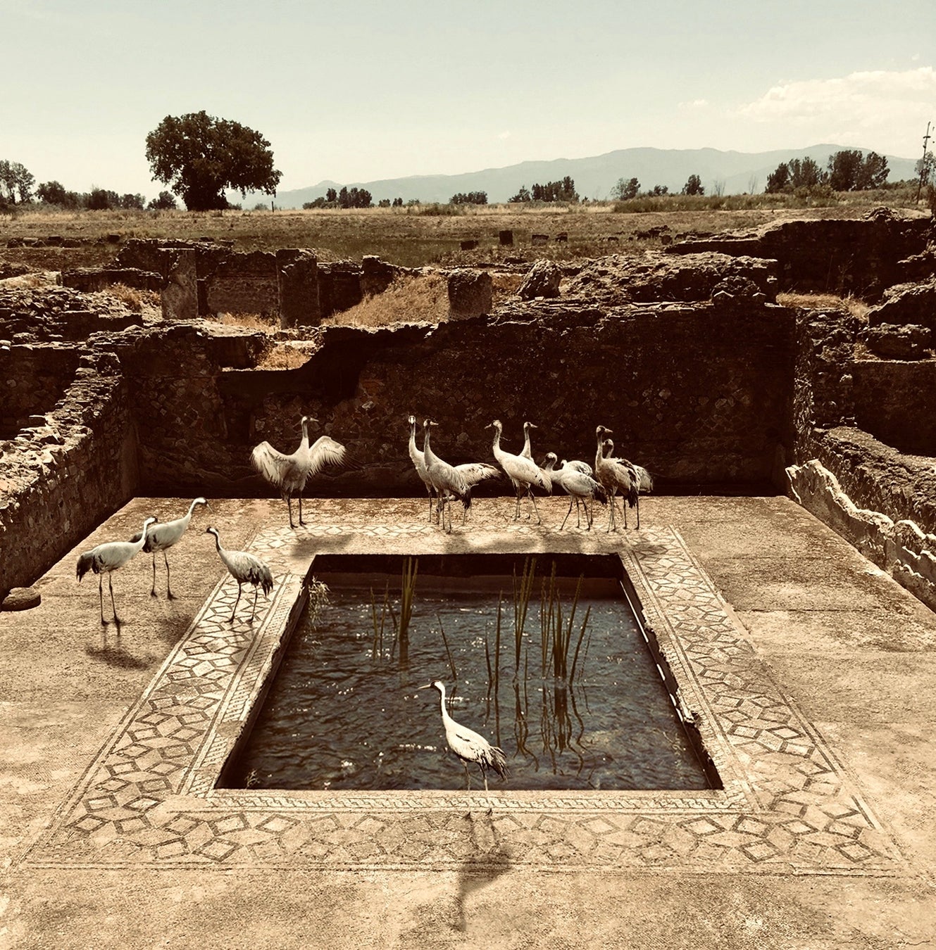 タンチョウの渡りの中継地としても知られるシバリ。ローマ時代の別荘に残るモザイク画のモチーフを再現。