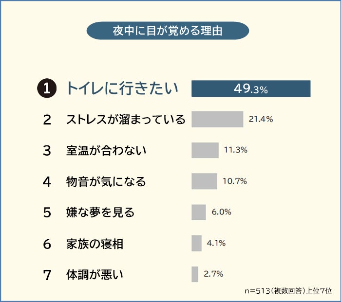 夜中に目が覚めることがある513人に「夜中に目が覚める理由」を聞いたところ、1位は「トイレに行きたい(49.3%)」で、半数近くの人から票を集めました。水分を控えても、体調や体質により、トイレに行きたくなってしまう人もいます。