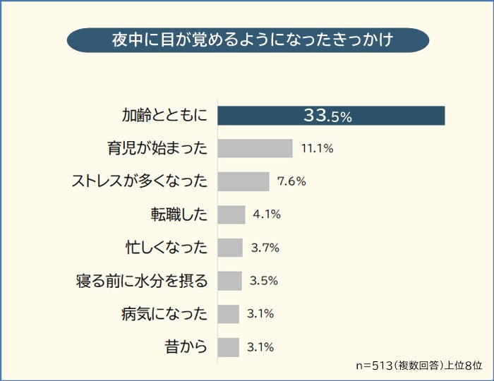 夜中に目が覚めるようになったきっかけとして最も多かったのは「加齢とともに(33.5%)」でした。2位「育児が始まった(11.1%)」、3位「ストレスが多くなった(7.6%)」、4位「転職した(4.1%)」が続きます。