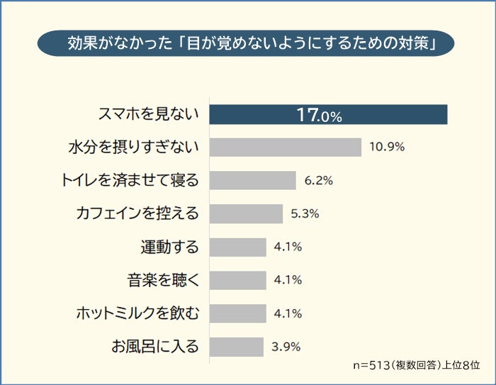 効果がなかった「目が覚めないようにするための対策」を聞いたところ、「スマホを見ない(17.0%)」がトップ。「寝る前にスマホを見ない」は睡眠の質をアップするためによく取り上げられる方法ですが、効果はなかったと感じた人も多くなりました。