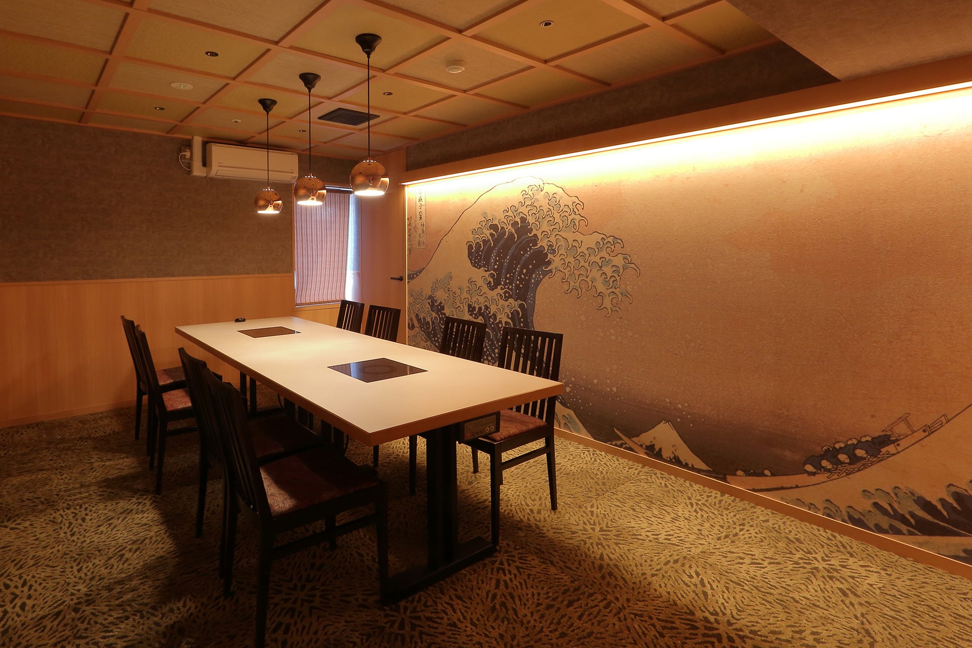 各部屋ごとにコンセプトが定められた個室は葛飾北斎の「神奈川沖浪裏」「山下白雨」をはじめ「風神雷神図屏風」や「龍」といった豪華絢爛な浮世絵や水墨画で彩られ、店内で“日本の美意識”を随所に感じることができます。