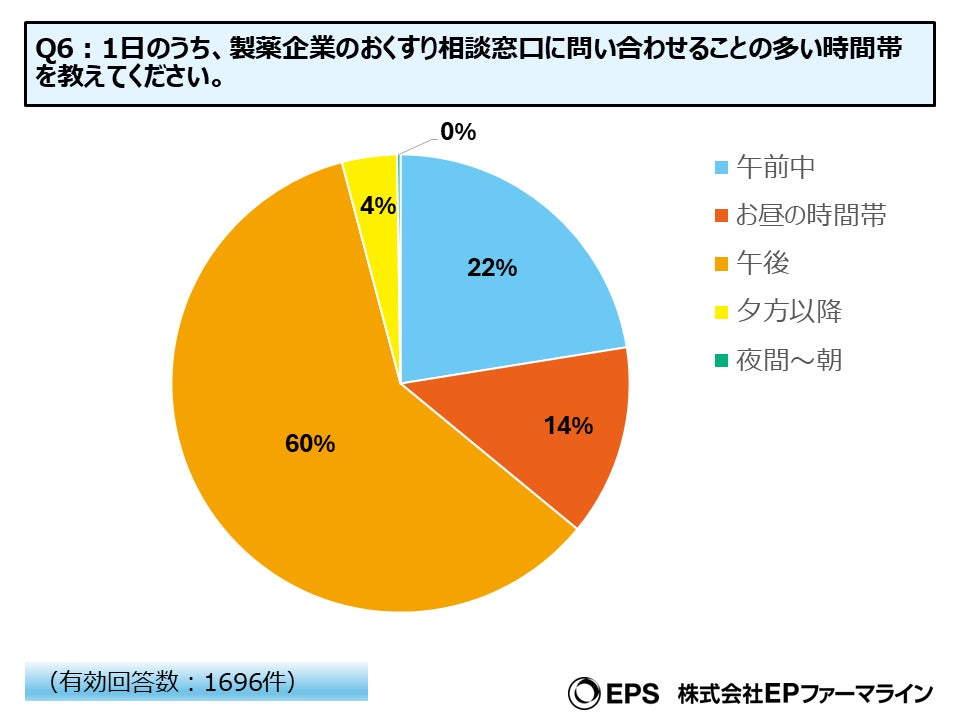 おくすり相談窓口に問い合わせる時間帯としては午後(13:00~17:00)が約60%と一番多い結果となりました。しかし、割合として夕方以降~朝の時間帯は少なかったものの、「対応時間を長くしてほしい」「土日祝も対応してほしい」などの対応時間に関する要望が多くあげられました。