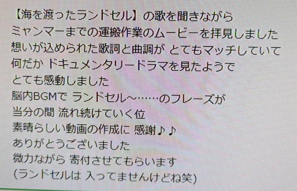 ランドセルの寄付の経緯のビデオを作成し、英語とビルマ語のルビをつけて、YouTube動画として公開しました。