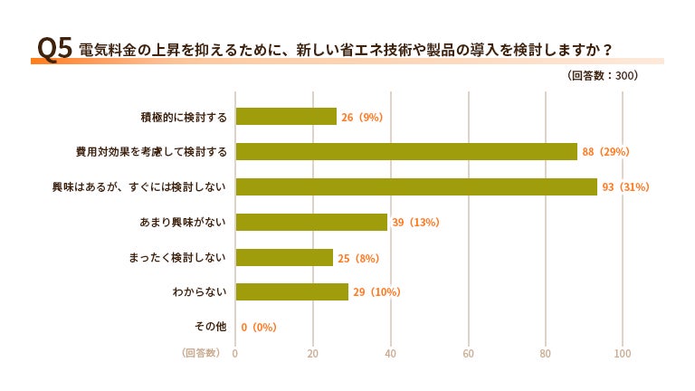 新しい省エネ技術や製品の導入に関しては、「費用対効果を考慮して検討する」が29%(88人)、「興味はあるが、すぐには検討しない」が31%(93人)と過半数以上が関心を示しつつも慎重な態度を取っていることがわかります。「積極的に検討する」と回答した方は9%(26人)に留まり、導入に積極的な層は少ないようです。