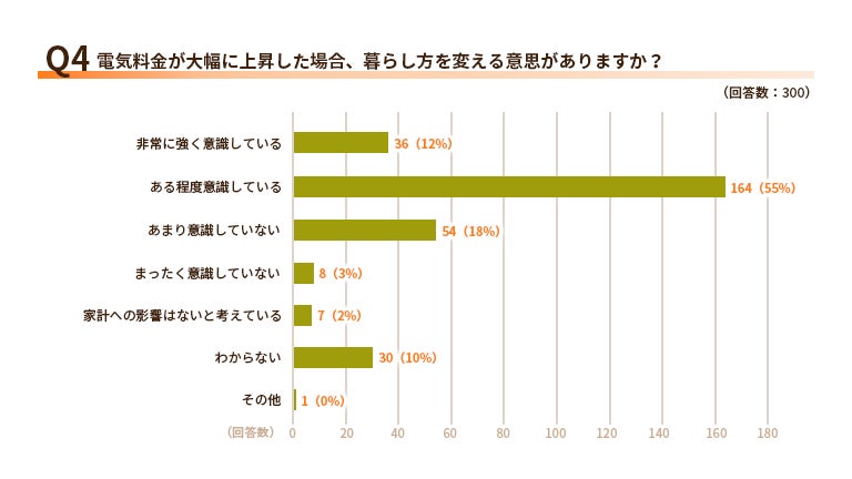 電気料金が大幅に上昇した場合の暮らし方の変化について、全体の半数以上にあたる55%(164人)が「ある程度意識している」と回答し、多くの方が生活の工夫や見直しを考えていることがうかがえます。「非常に強く意識している」と答えた12%(36人)を含めると、7割近くの方が何らかの対応を検討する姿勢を持っていました。