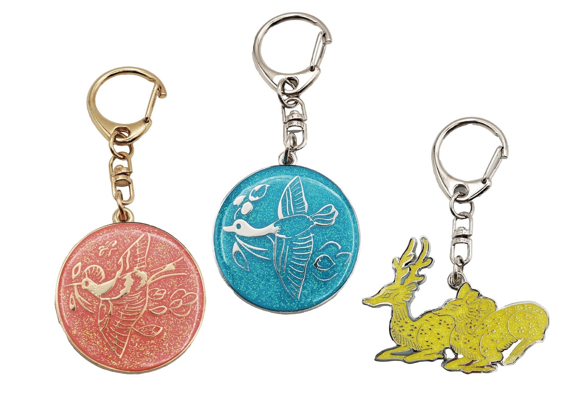 花喰鳥や鹿といった動物文様デザインのキーホルダーです。金色もしくは銀色のラメ入りでキラキラと輝きます。花喰鳥2種、鹿1種の3種展開です。