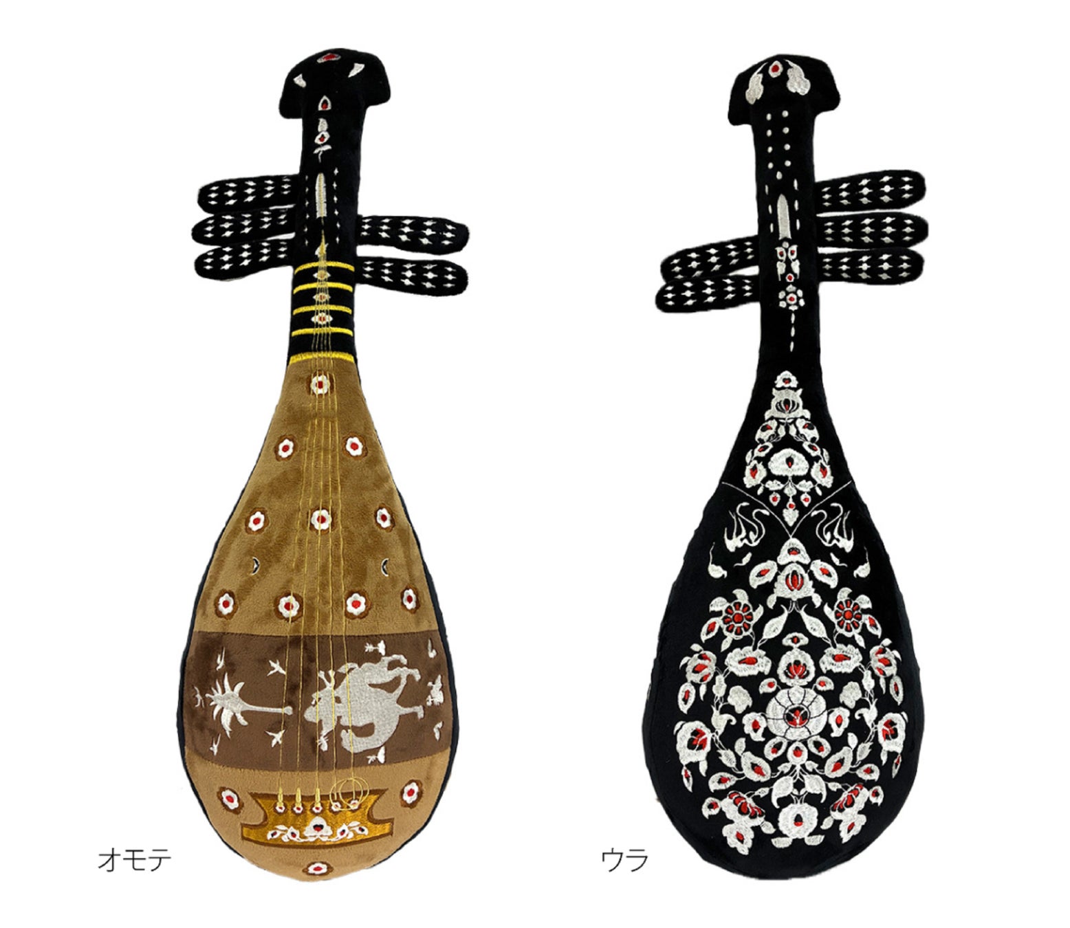 螺鈿細工が美しい「螺鈿紫檀五絃琵琶(らでんしたんのごげんびわ)」をモチーフにしたぬいぐるみです。長さ約62cmと、本物の琵琶よりやや小さ目のサイズにし、快適な抱き心地を目指しました。