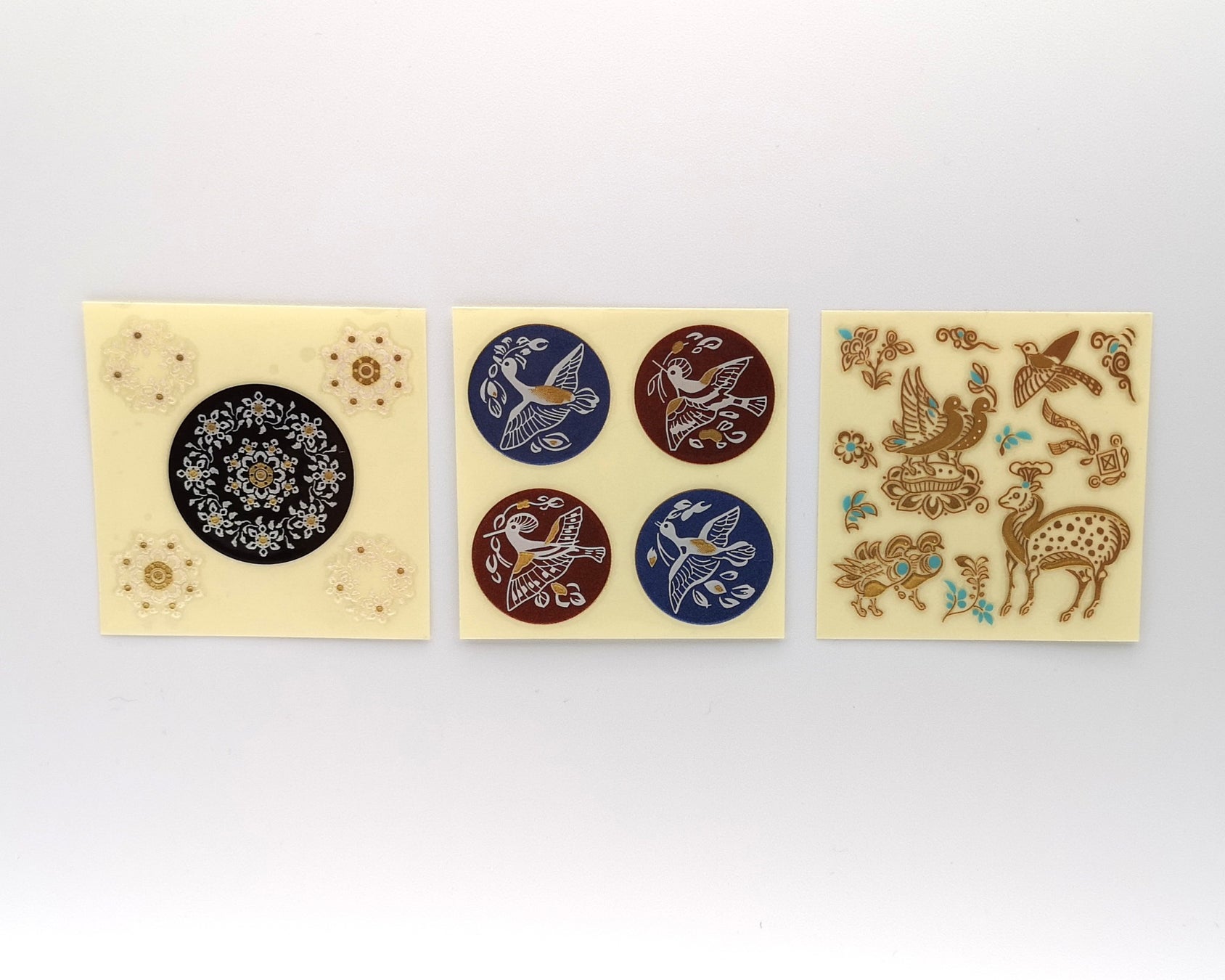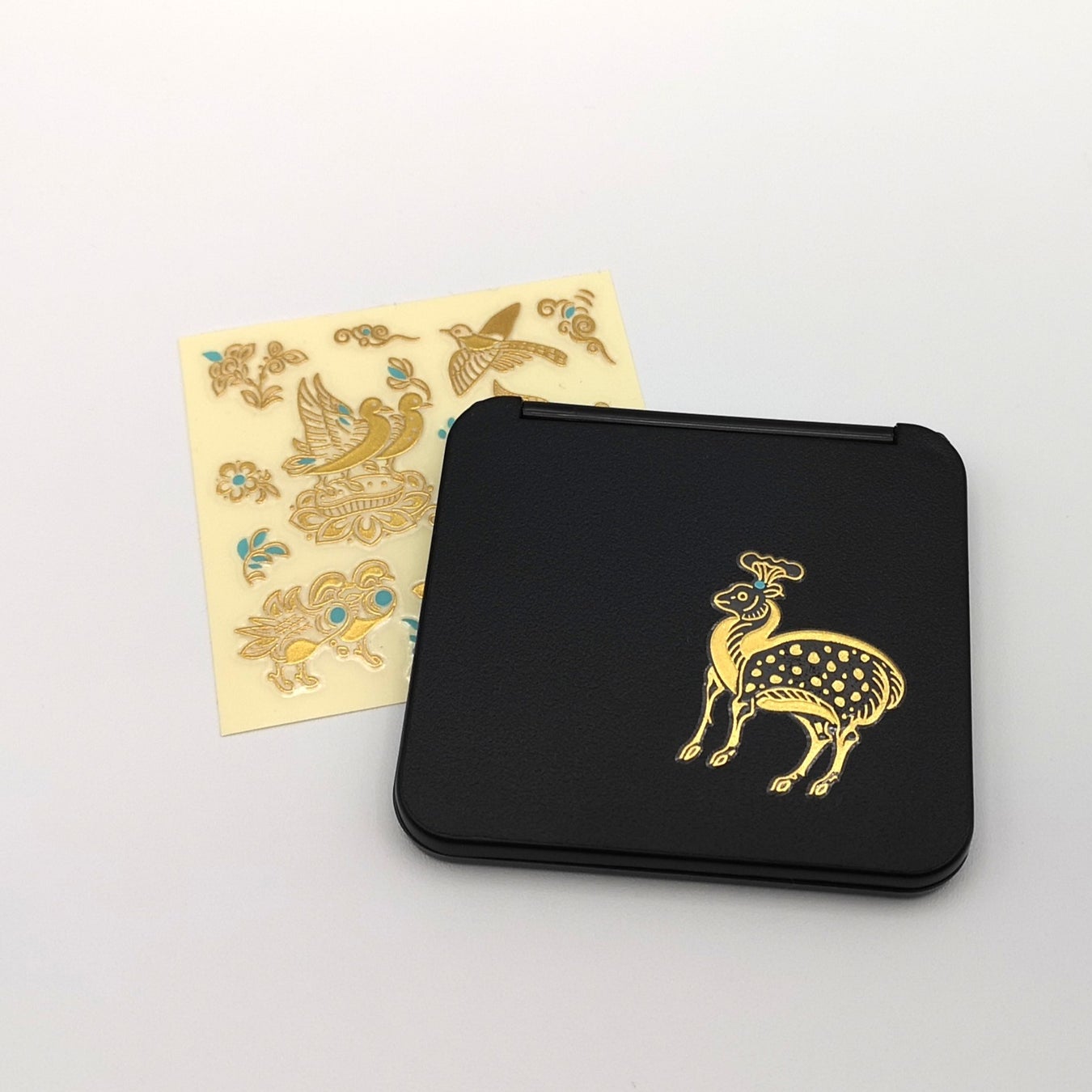「撥鏤碁子」や「螺鈿箱」、宝物にあしわらわれた動物たちをモチーフに、3種の蒔絵シールを作りました。シンプルな手鏡や小物を華やかにアレンジできます。