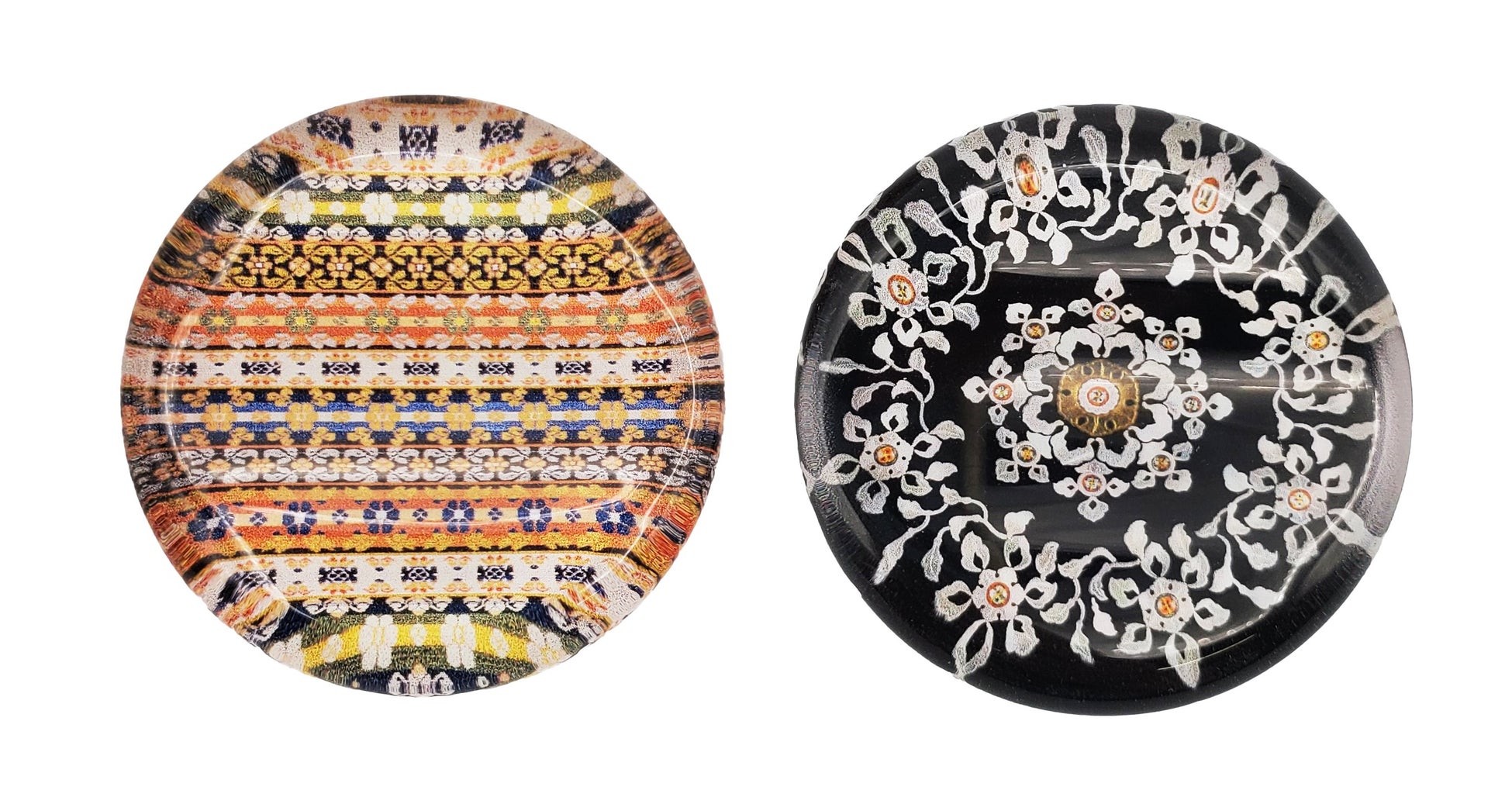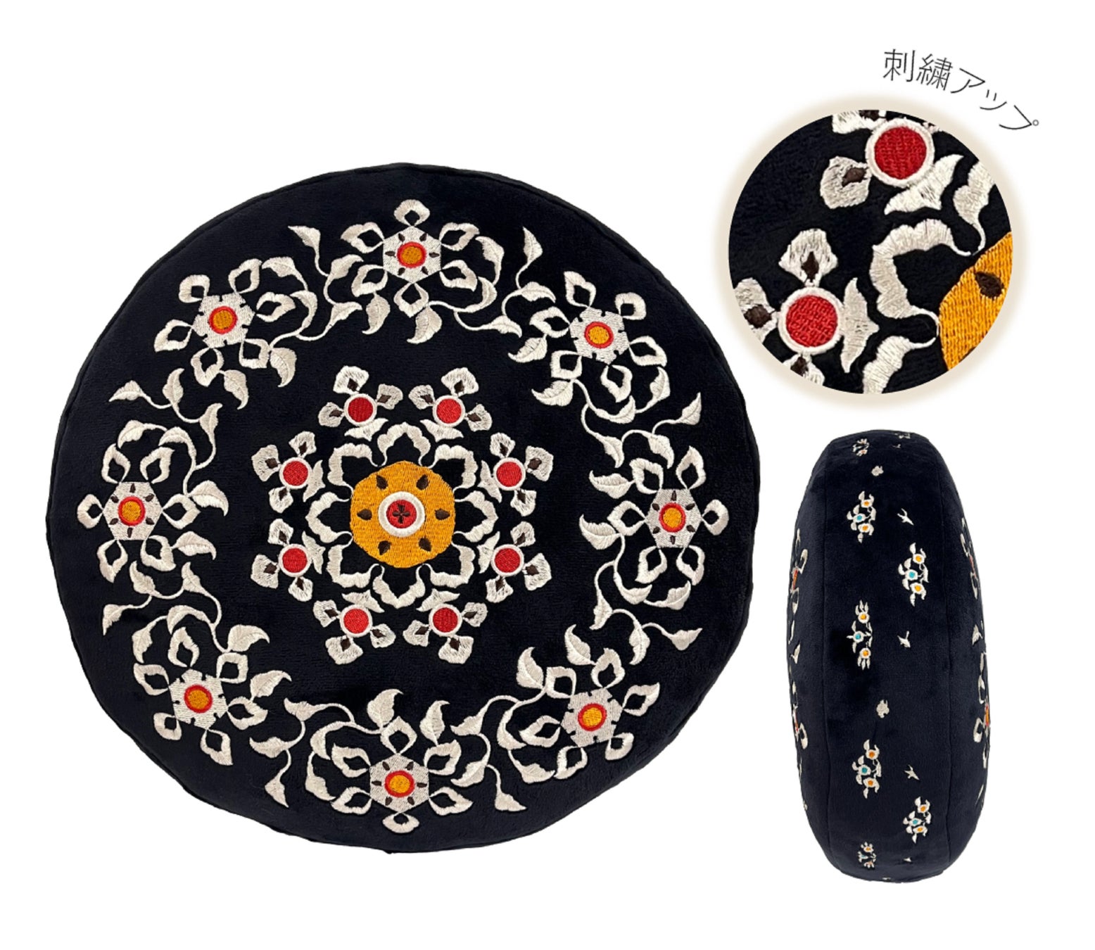 華やかな宝相華文様の「螺鈿箱(らでんばこ)」で直径約35cmのクッションを作りました。「螺鈿箱」の現代にも通じるデザイン美が、インテリアのアクセントになります。