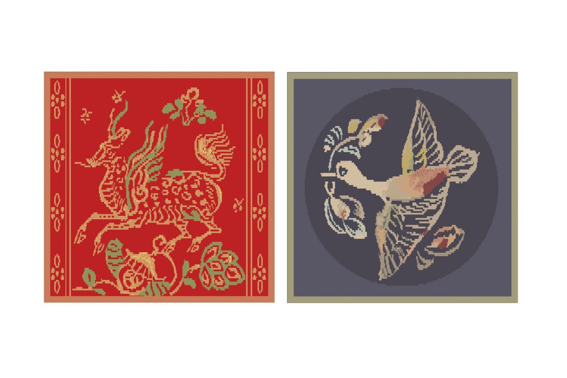 ほつれにくく、優れた耐久性を備えたシェニール織で、オリジナル柄のハンカチタオルを作りました。赤色が鮮やかな天馬の柄と、シックな花喰鳥の柄の2種展開です。