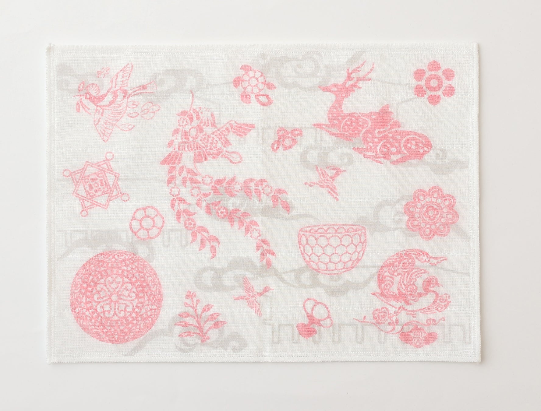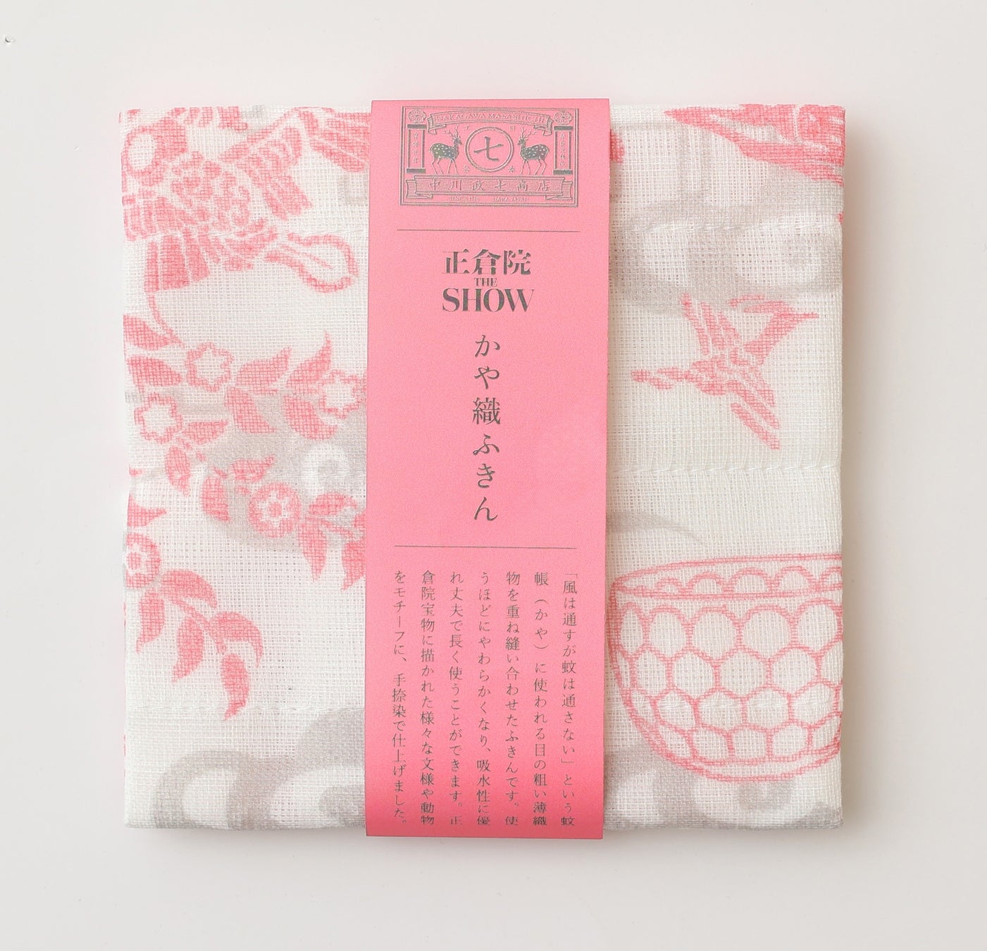 奈良の工芸「かや織」でつくられた中川政七商店のロングセラー「かや織ふきん」が、本展オリジナルデザインで登場。花喰鳥や鹿など正倉院ゆかりの文様を華やかにあしらいました。