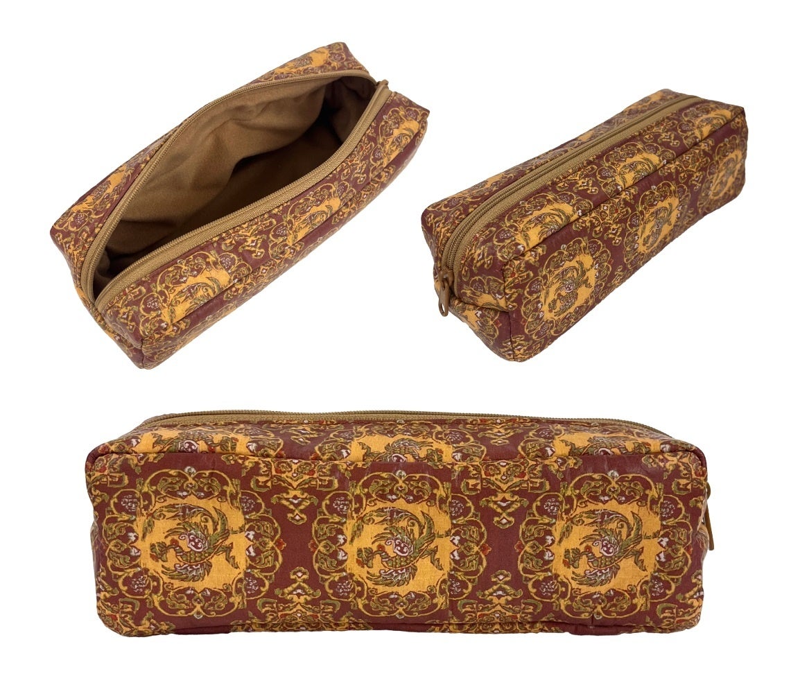 聖武天皇ご愛用の肘置き「紫地鳳形錦御軾(むらさきじおおとりがたにしきのおんしょく)」をペンケースにしました。紫の地に鳳凰の文様が映える豪華なデザインですが、長さ約20cmで収納力もあります。